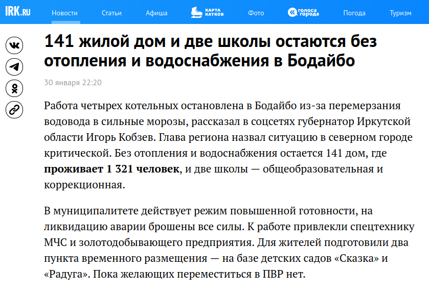 141 жилой дом и две школы остаются без отопления и водоснабжения в Бодайбо