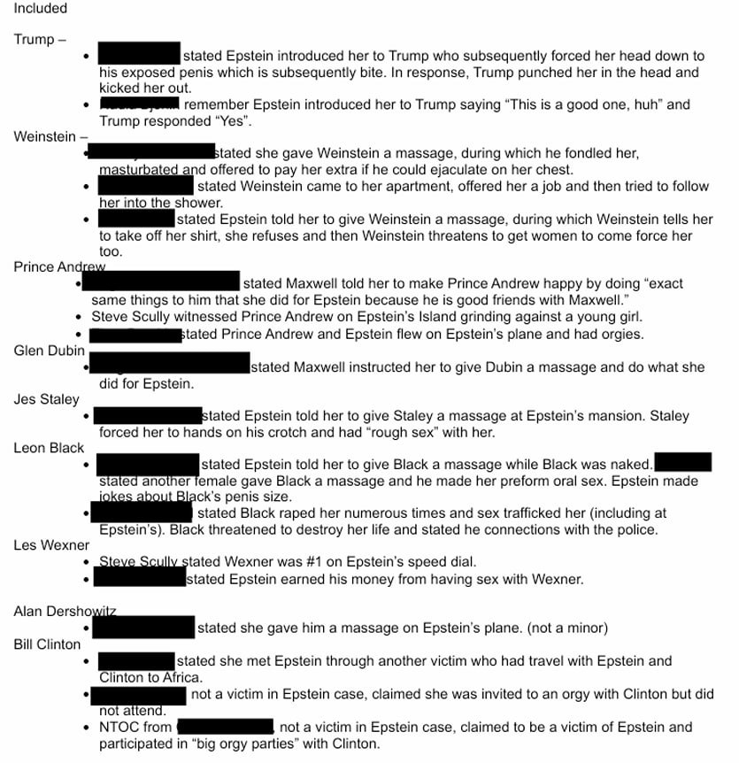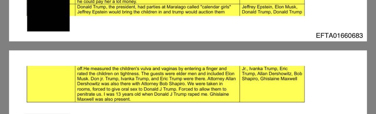 Что утверждается в слитых материалах: — Трамп устраивал вечеринки в поместье Мар-а-Лаго, называя их «девушками из календаря», куда Эпштейн привозил несовершеннолетних; — Трамп проводил унизительные осмотры влагалищ девочек «на упругость» и продавал детей гостям на аукционе; — Одна из пострадавших заявляет, что в 13 лет была изнасилована Трампом; — Жертв сексуального и физического насилия хоронили прямо на гольф-полях Трампа, а свидетелям угрожали страшной расправой; — Среди гостей были Илон Маск, Дон-млдаший, Иванка и Эрик Трампы, адвокаты Аллан Дершовиц и Боб Шапиро и другие; — В одном из файлов жертва заявила, что Трамп присутствовал, когда её дядя убил её новорожденного ребёнка; — Также Telegraph со ссылкой на материалы пишет, что Билл Гейтс мог заразиться венерическим заболеванием на одной из вечеринок Эпштейна.