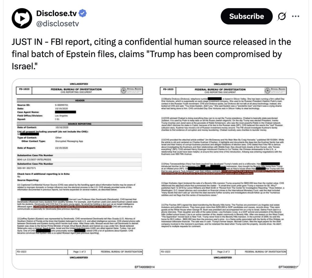 В Рассекреченном отчете ФБР с первого срока президентства Трампа в последней партии документов, связанных с Эпштейном, утверждается, что Трамп находился под влиянием Израиля, а его еврейский зять Джаред Кушнер был "реальным мозгом" его президентства.