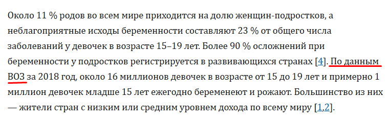 >>61766771 >исследования показывают, что самка абсолютно спокойно может родить здорового человека с 12 лет, Все графики показывают повышение рисков до 18 лет, но тебе на правду поебать https://www.who.int/news-room/fact-sheets/detail/adolescent-pregnancy Adolescent mothers (aged 10–19 years) face higher risks of eclampsia, puerperal endometritis and systemic infections than women aged 20–24 years, and babies of adolescent mothers face higher risks of low birth weight, preterm birth and severe neonatal condition.