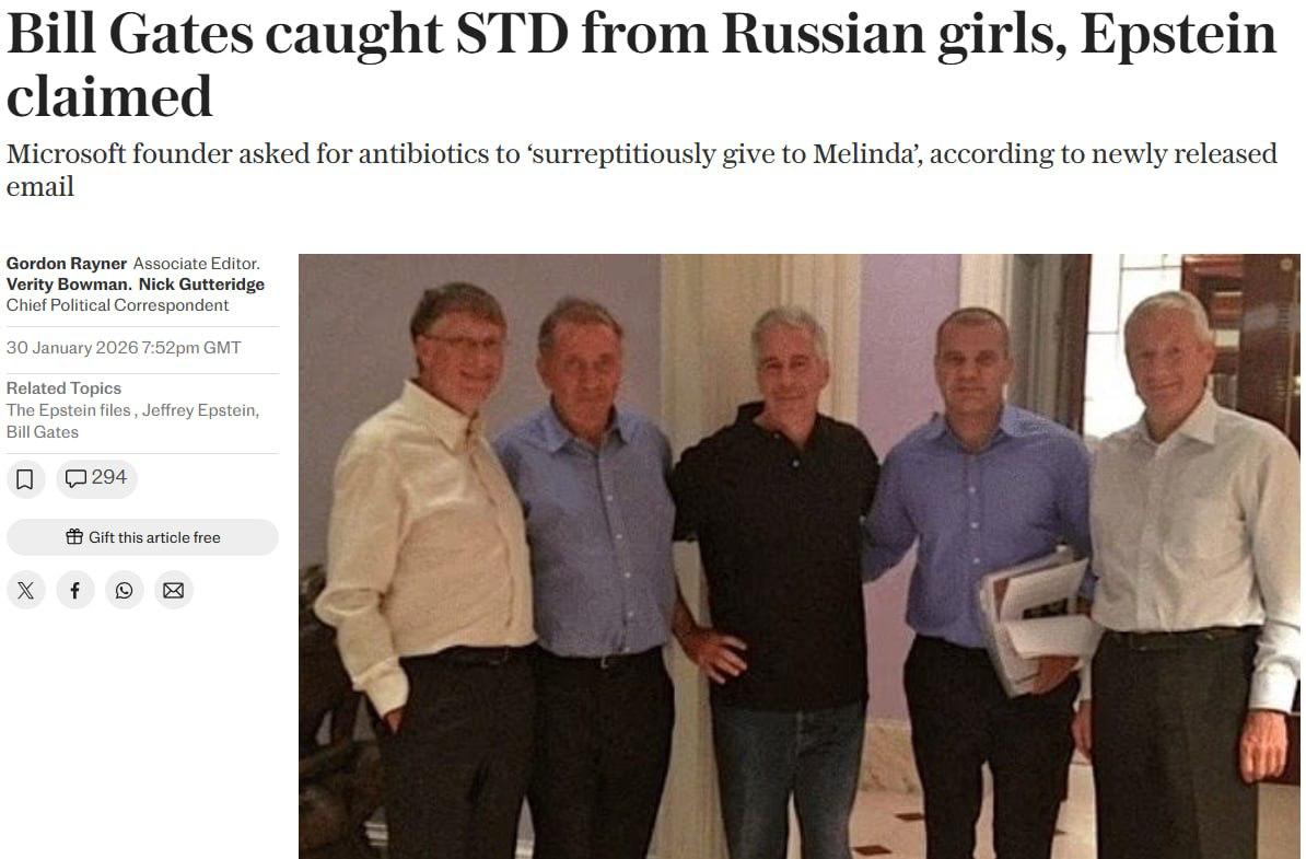 В новых файлах Эпштейна, которые уже были удалены сказано, что Билл Гейтс подхватил венерическое заболевание от одной из русских девочек на острове Эпштейна. Он тайно подмешивал антибиотики своей жене Мелинде, чтобы она не заразилась от него.