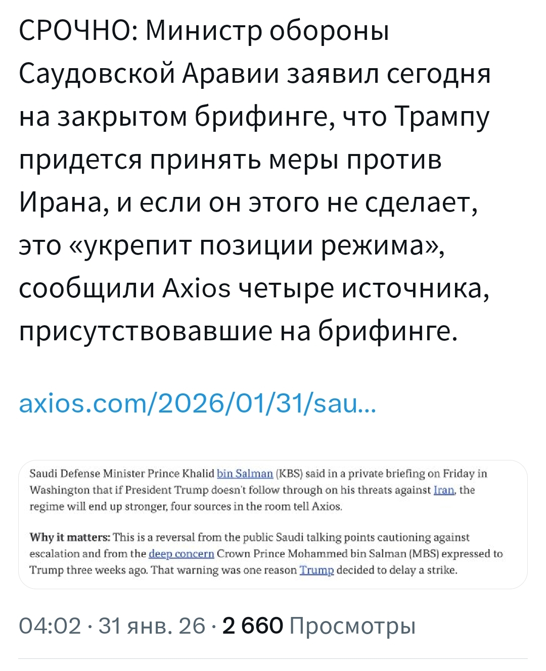 >Министр обороны Саудовской Аравии принц Халид бин Салман (КБС) заявил на закрытом брифинге в Вашингтоне в пятницу, что если президент Трамп не выполнит свои угрозы в отношении Ирана, режим станет сильнее.
