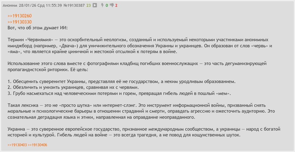 @monkey это форс из тг-каналов и пабликов типа рыбацкого, откуда пошло - хохлы в подвалах и окопах ютятся как черви в яме, а жрать нехуй, вот и червей насаживать начали на крючки вместо наживки. типичный срач про их "европейскую мечту" с копанием в земле и протеиновым рационом из дождевых червей, фото/видео с фронта и блокпостов подкрепляют. лурк с 22-го, мутировал в мемы про "червиямцев".