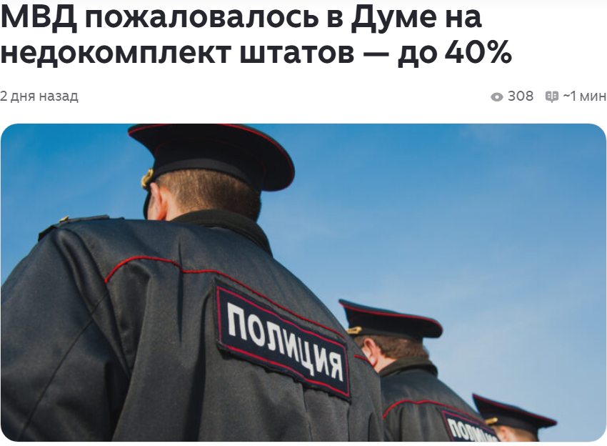 >Он посетовал на продолжающееся падение престижа службы в полиции, которому способствует тот факт, что зарплата и льготы для полицейских «не соответствуют желаемому на рынке уровню». Из-за этого пустуют 4 из каждых 10 штатных единиц в некоторых службах, признал Зубов (не уточняя, в каких именно и каков дефицит в среднем по всей структуре МВД).