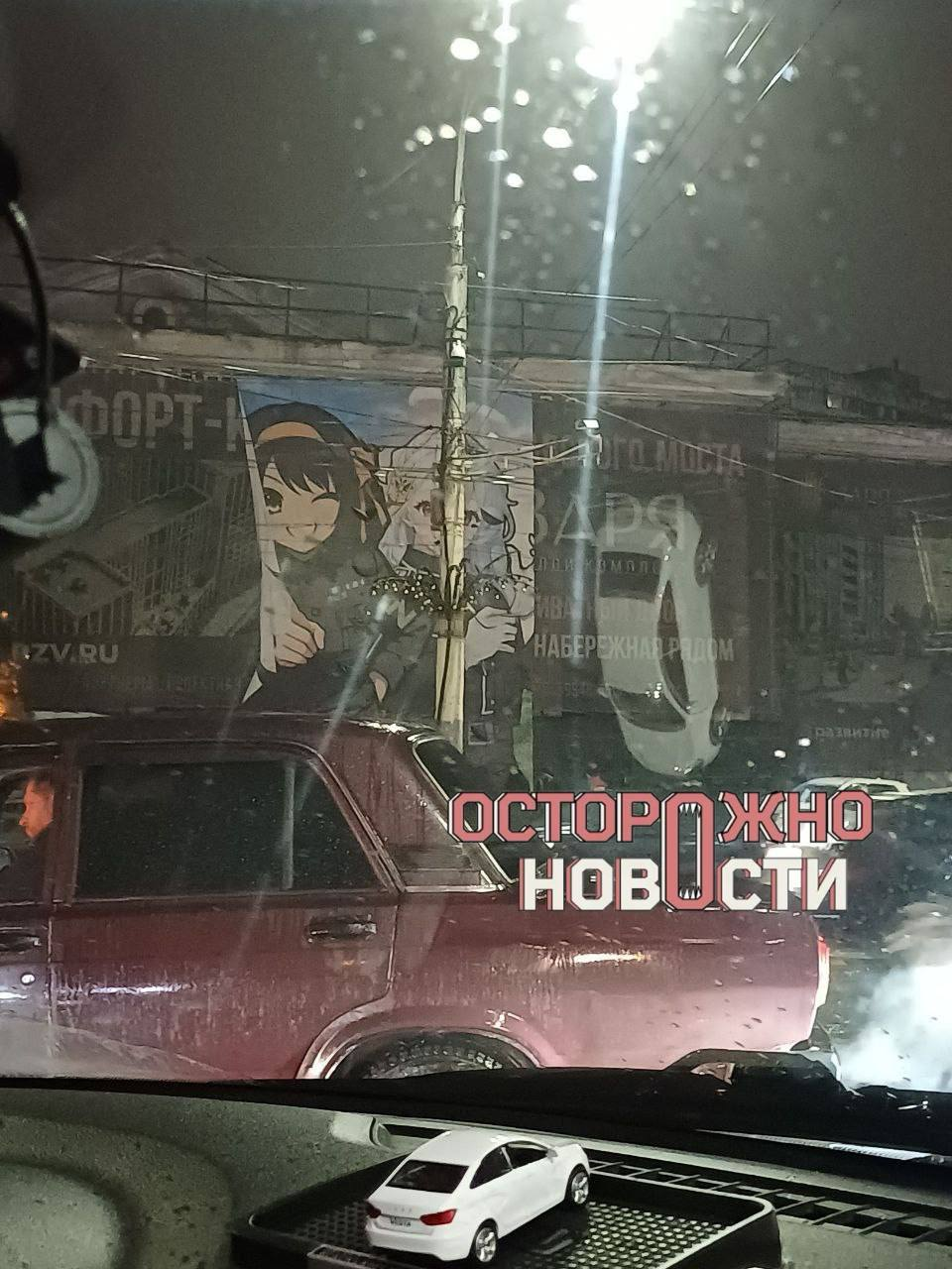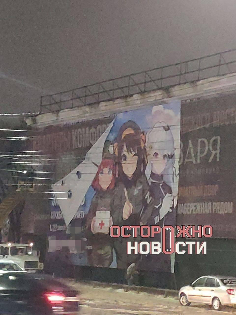 Баннер с персонажами аниме, выступающих в поддержу СВО, на короткое время появился на здании ДК имен