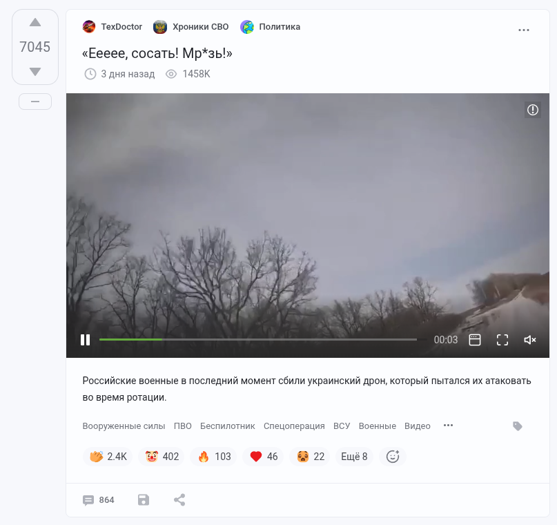 >>61788248 (OP) Тег "политика" убери и комментарии заменятся на что-нибудь вроде "значит следующий уебёт". >>61788276 Да потому что там живых людей в политике полторы закрепные коляски, остальные это копирайтеры на госслужбе. Их задача по темнику строчить и плюсы ставить. Самое лучшее для наблюдения это какой-нибудь околополитический пост без соответствующего тега, сразу боты исчезают и там чуть ли не кранование хотят в комментариях, и каждый второй на статью себе строчит.