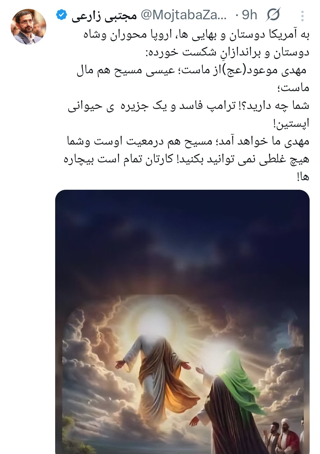 >Иранский парламентарий Моджтаба Зареи продолжает высмеивать американцев и Трампа: «Обещанный Махди (Скрытый Имам) — наш; Иисус Христос тоже наш. А что у вас?! Коррумпированный Трамп и остров животных Эпштейна! Наш Махди придёт, и Мессия будет рядом с ним — а вы ничего не сможете сделать! Ваша история окончена, жалкие люди». Режим скораптил Иисуса Христа. Ну тут как бы без вариантов, могли на сионистов свалить, а прямо отчаянно просят горячего и десерта сразу.