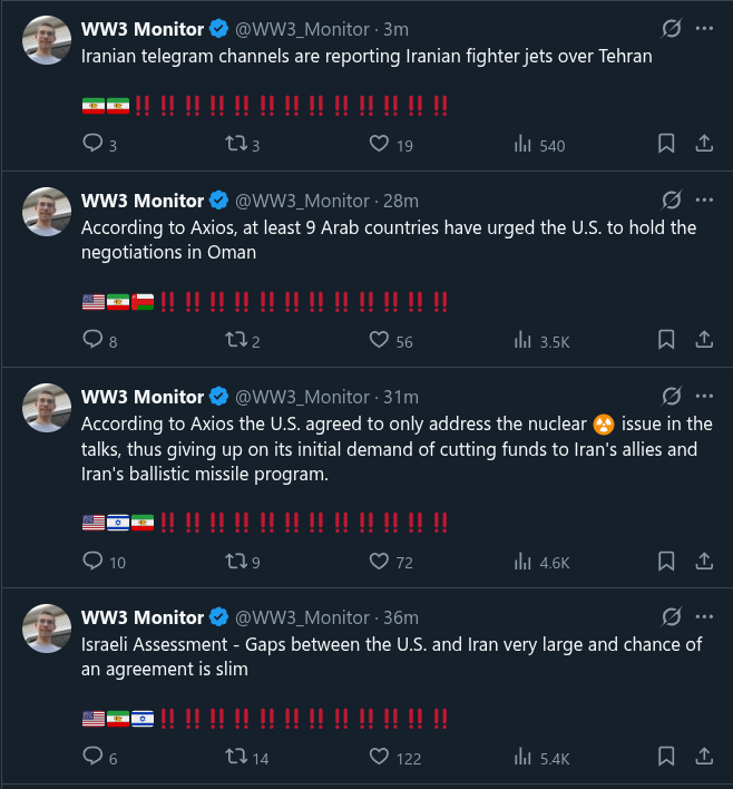 >«Возможно, место проведения переговоров изменится во втором раунде. Наша основная позиция — противодействие любому выводу урана из страны; однако мы готовы снизить уровень обогащения. Мы не хотим региональной войны, но любое американское нападение затмит этот вопрос». Америка и её союзники концертируют и разворачивают войска в регионе, то есть со временем их станет больше, их уровень инфильтрации, информационно-стратегической целостности и координации будет максимальным и критическим. Однако Иран схватился за стратегию растягивание переговоров, ну что-то видимо союзникам на Ближнем предложил, чтобы выиграть время. Только время получает Америка, глобальных природных катастроф не предвидится, реконфигурировать электоральным воздействием ситуацию не получится - их уже признали террористами и половина ЕС начинает аккуратно критиковать повестку миграции и реагировать. У Турции наверное сейчас тоже инфляции защекотит, чтобы своими делами занимались. Китай что-то может сделать, но впрямую то он не полезет - сразу третья. Внутренняя ситуация в Америки и на рынках не имеет какого-то прогноза неожиданности и катастрофы.