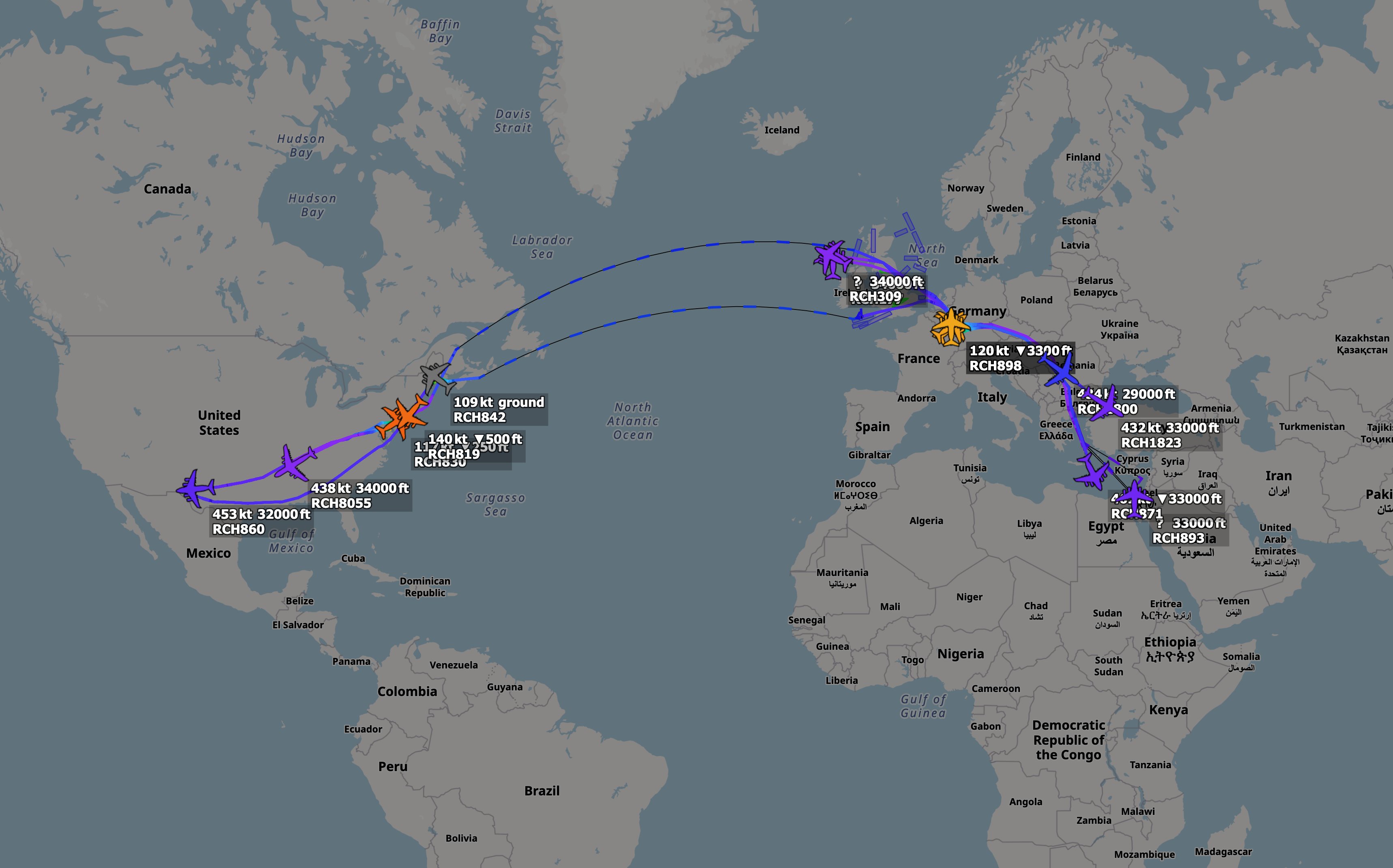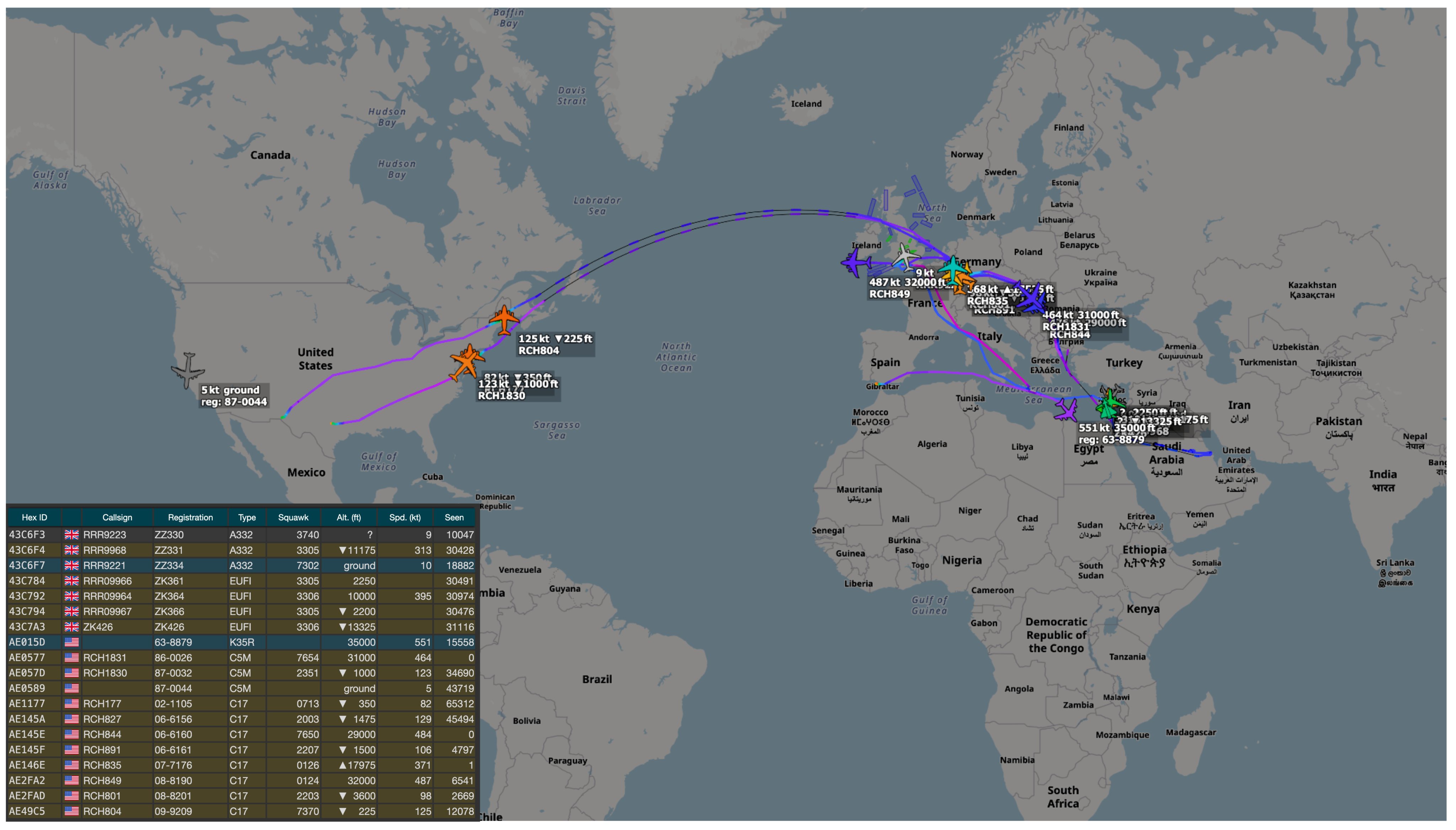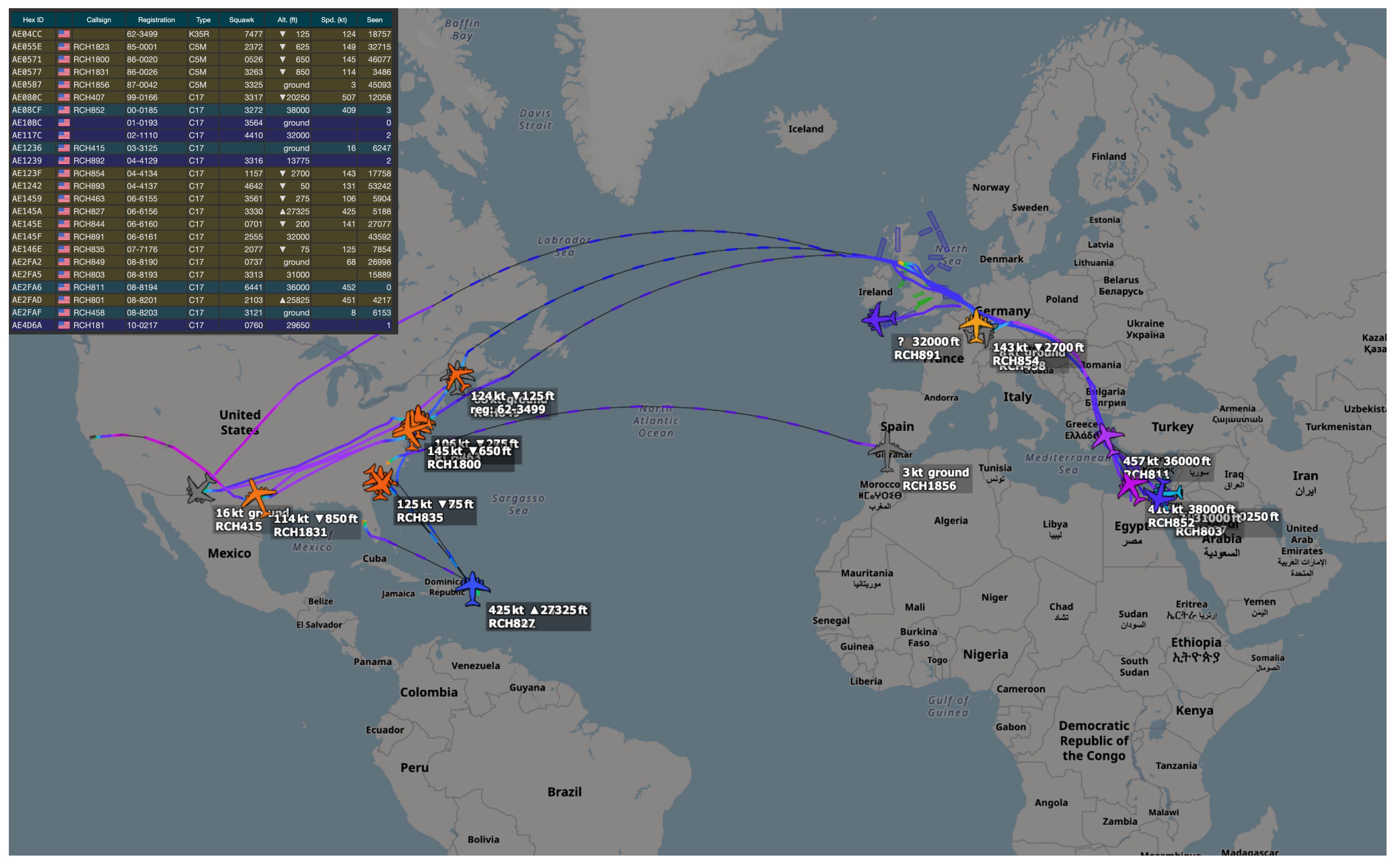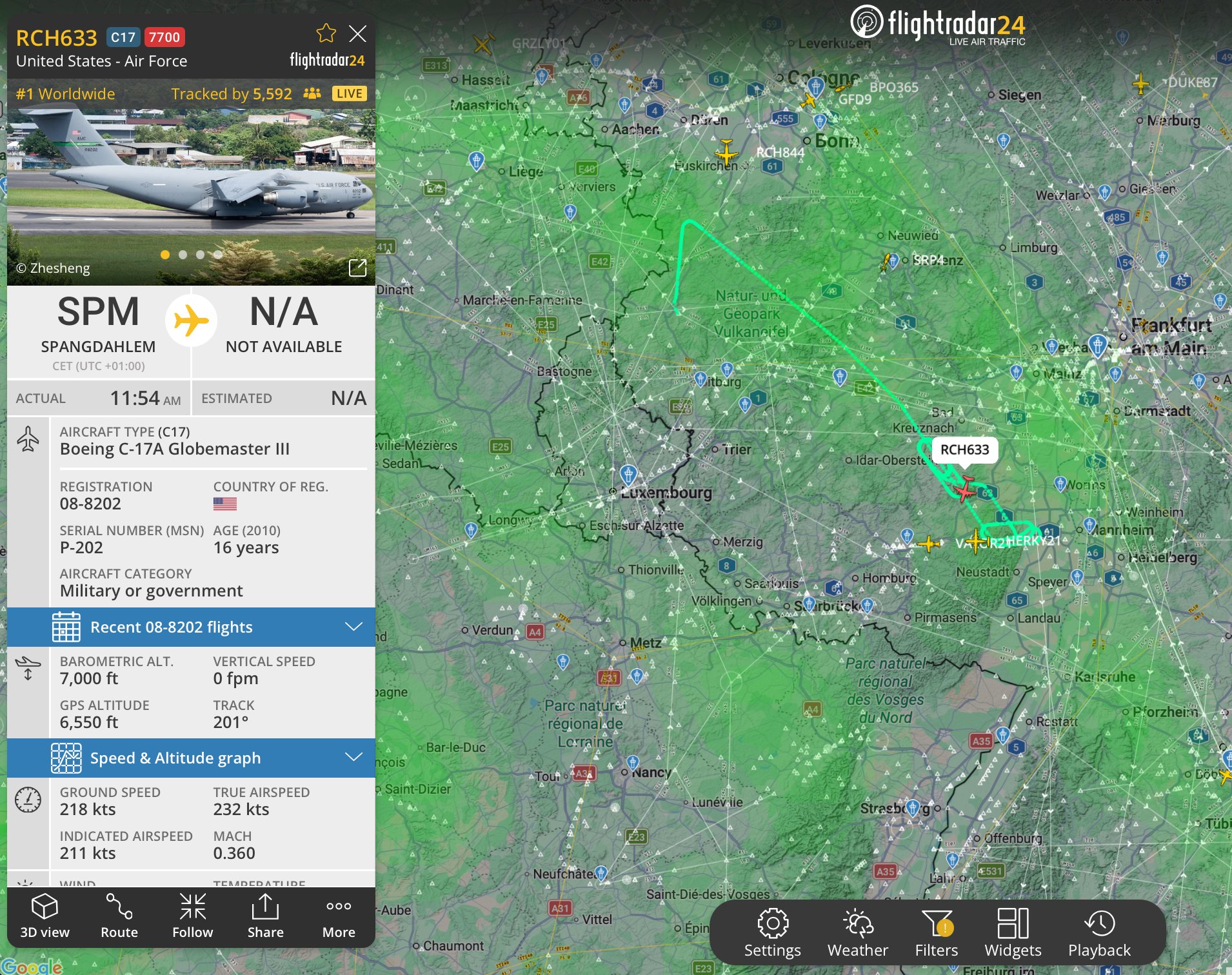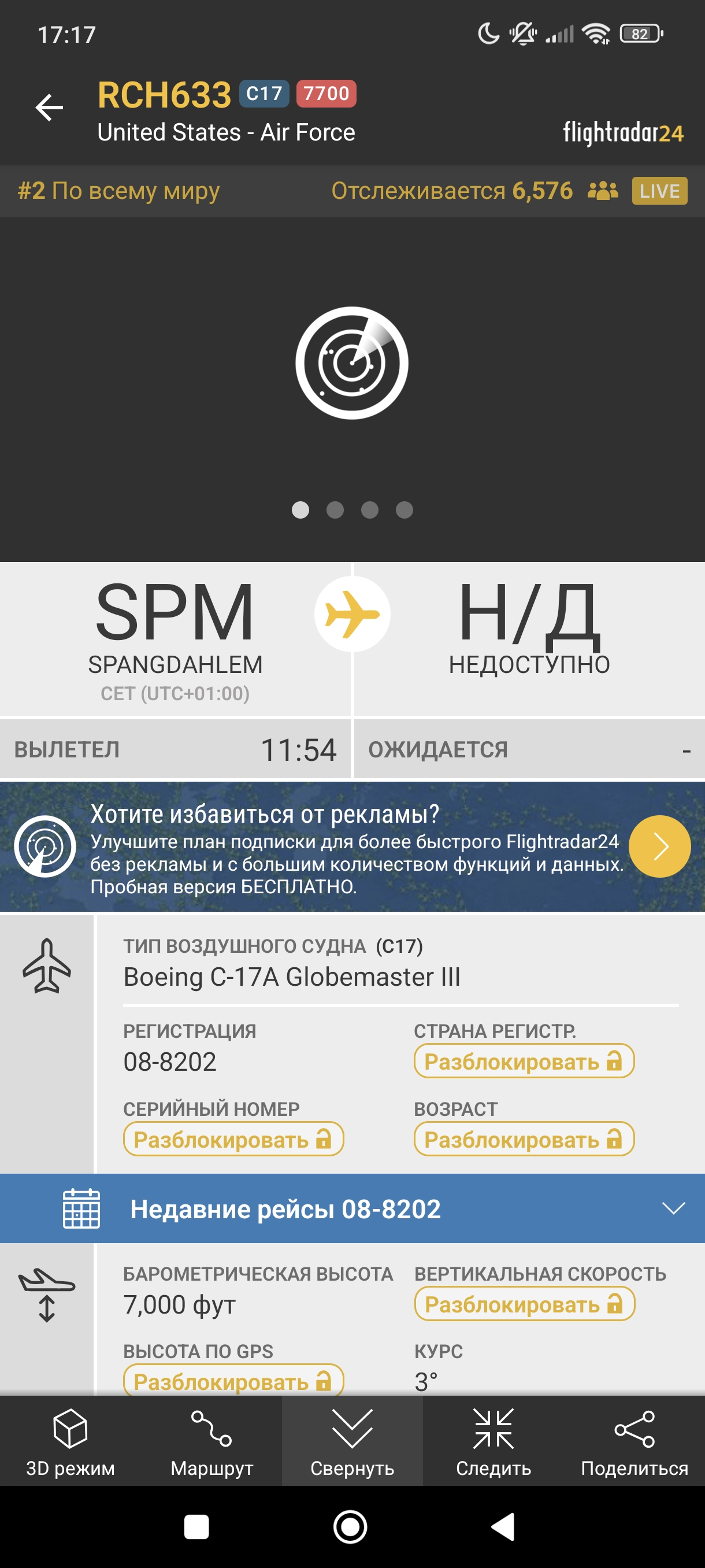 >>61808258 >Самолет ВВС США C-17A Globemaster III (RCH633) Регистрационный номер: 08-8202 | Шестнадцатеричный код: AE2FAE Вылетел с авиабазы Спангдахлем, Германия. Код ответчика: 7700 (аварийная ситуация в полете). В настоящее время сбрасывает топливо для снижения веса и безопасного возвращения/посадки.