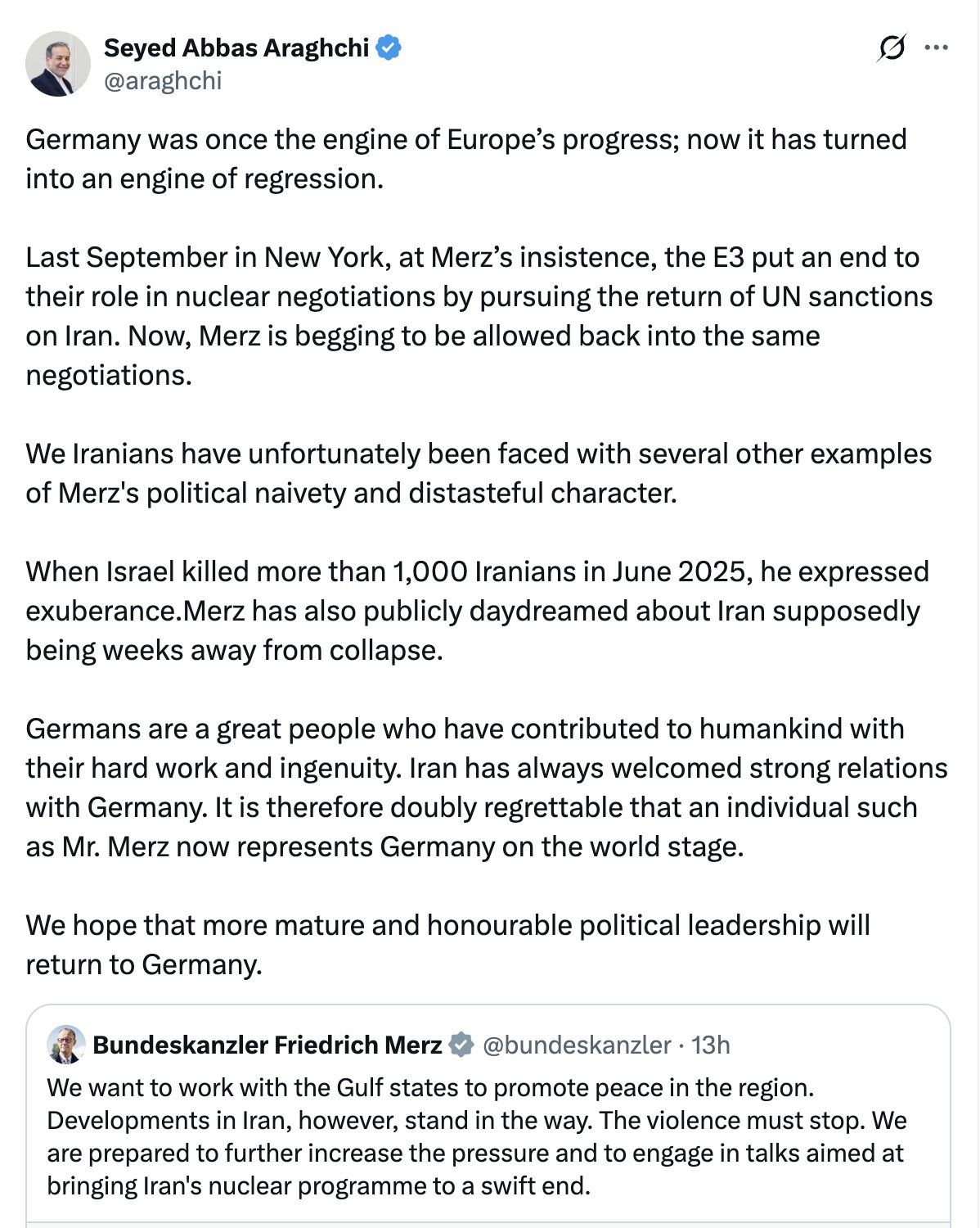 >Германия когда-то была двигателем европейского прогресса; теперь она превратилась в двигатель регресса. В сентябре прошлого года в Нью-Йорке, по настоянию Мерца, страны «большой тройки» прекратили свое участие в ядерных переговорах, добиваясь возвращения санкций ООН против Ирана. Теперь Мерц умоляет разрешить ему вернуться к этим же переговорам. Нам, иранцам, к сожалению, пришлось столкнуться с несколькими другими примерами политической наивности и неприятного характера Мерца. Когда Израиль убил более 1000 иранцев в июне 2025 года, он выразил ликование. Мерц также публично мечтал о том, что Иран якобы находится в нескольких неделях от краха. Немцы — великий народ, который внес вклад в развитие человечества своим трудолюбием и изобретательностью. Иран всегда приветствовал прочные отношения с Германией. Поэтому вдвойне прискорбно, что такой человек, как г-н Мерц, теперь представляет Германию на мировой арене. Мы надеемся, что в Германию вернется более зрелое и достойное политическое руководство.