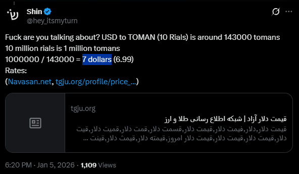 >После сообщений о возможном срыве американо-иранских переговоров иранская валюта резко упала. Риал снизился с ~1,55–1,57 миллиона за доллар до 1,655 миллиона