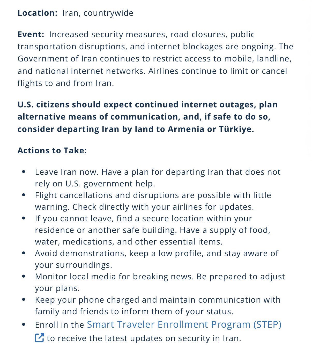 >В предупреждении содержится призыв к американцам «немедленно покинуть Иран», используя как коммерческие рейсы, так и наземные переходы через границу с Арменией и Турцией, и разработать планы, не зависящие от помощи Соединенных Штатов.