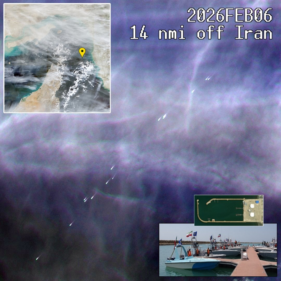 >Военно-морские силы Корпуса стражей исламской революции Ирана (КСИР) развернули около 40 быстроходных ударных кораблей в международных водах Ормузского пролива, примерно в 14 морских милях от иранского побережья, недалеко от базы Шахид Сейед Маджид в Сирике. Наблюдатели отметили следы от беспилотников на большой высоте, создавшие в этом районе перистые облака.