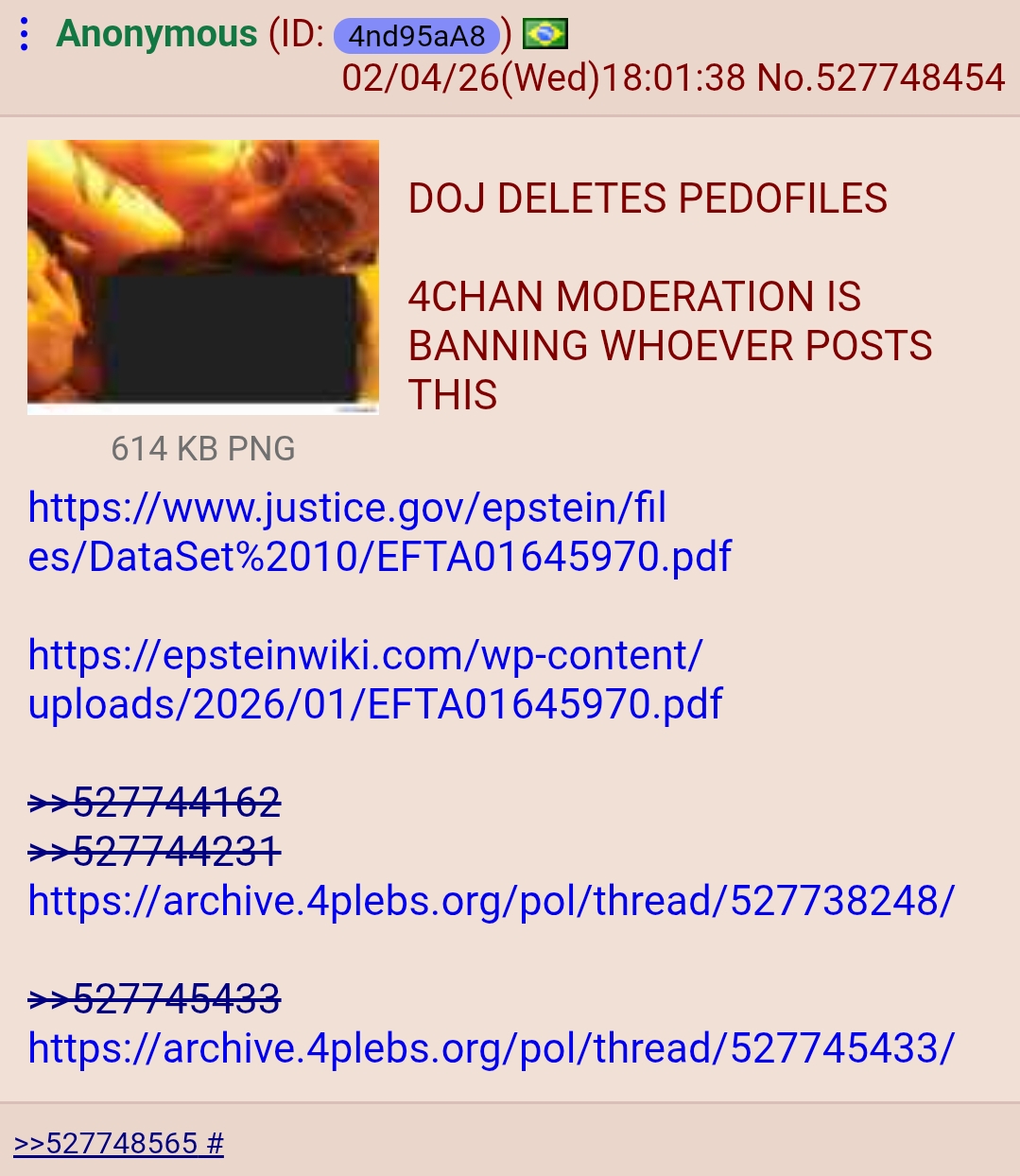 >>61793651 Самый сок в судебные документы и не попал. Потому что оба раза арест Эпштейна и обыски у него не были внезапными. Все записи и фото ебли детей явно были либо удалены, либо скрыты от следствия. Кроме того, это же администрация оранжевого уголовника. Я на 100% уверен, что если и были какие-то именно прямые улики в виде инкриминирующих записей или фото, то их просто не опубликовали, приказав исключить из списка файлов, переданных сотрудникам на обработку для цензурирования.