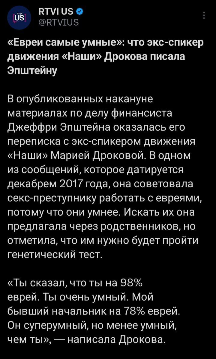 >>61794201 >Просто человек с головой на плечах понимает, что просто упоминание в "файлах" - ничего еще не значит, надо смотреть на контекст. Конечно. Даже Пугачеву упомянули в файлах Эпштейна.