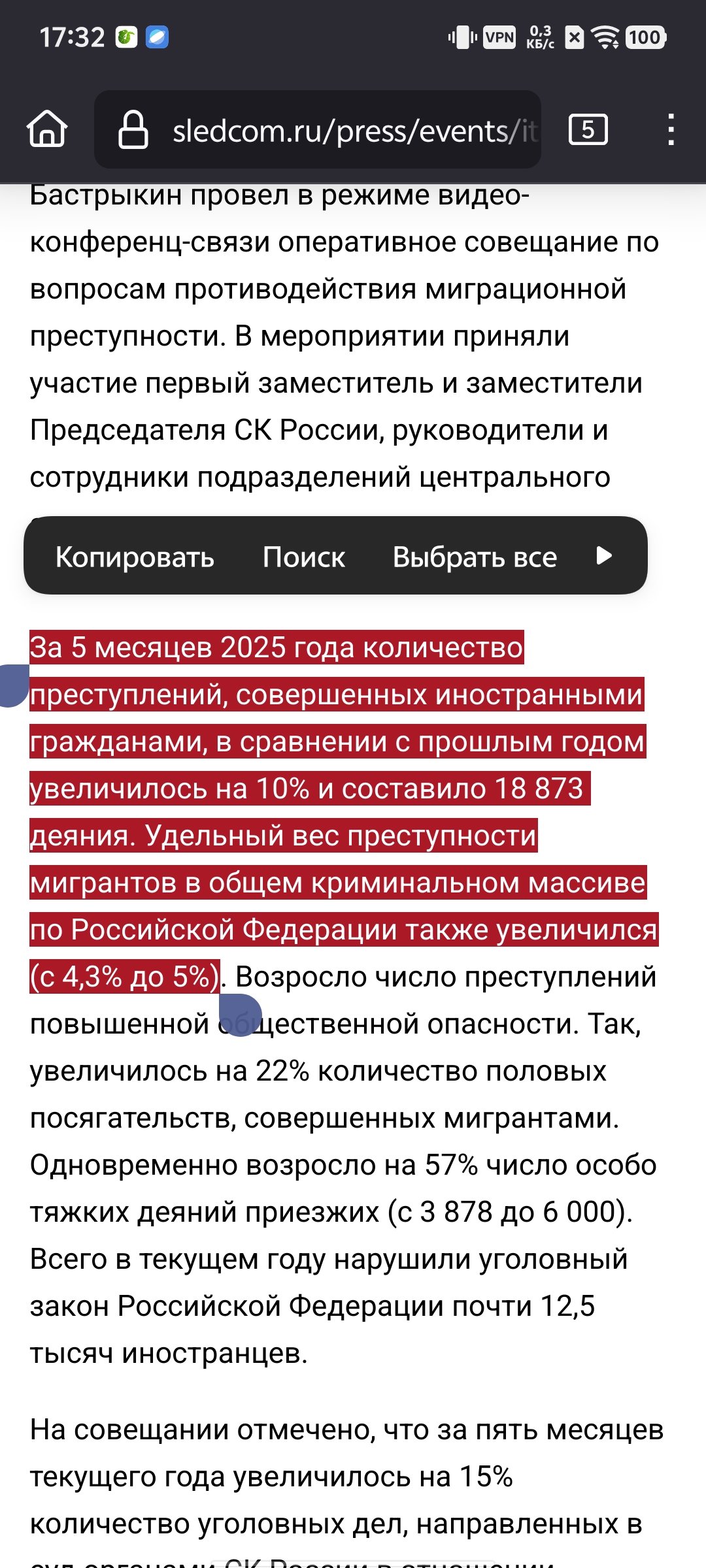 откуда такая стата в 99%? случилось чего? или официальный сайт СК РФ мне вркт о том что общая доля преступлений мигрантов 5 процентов?
