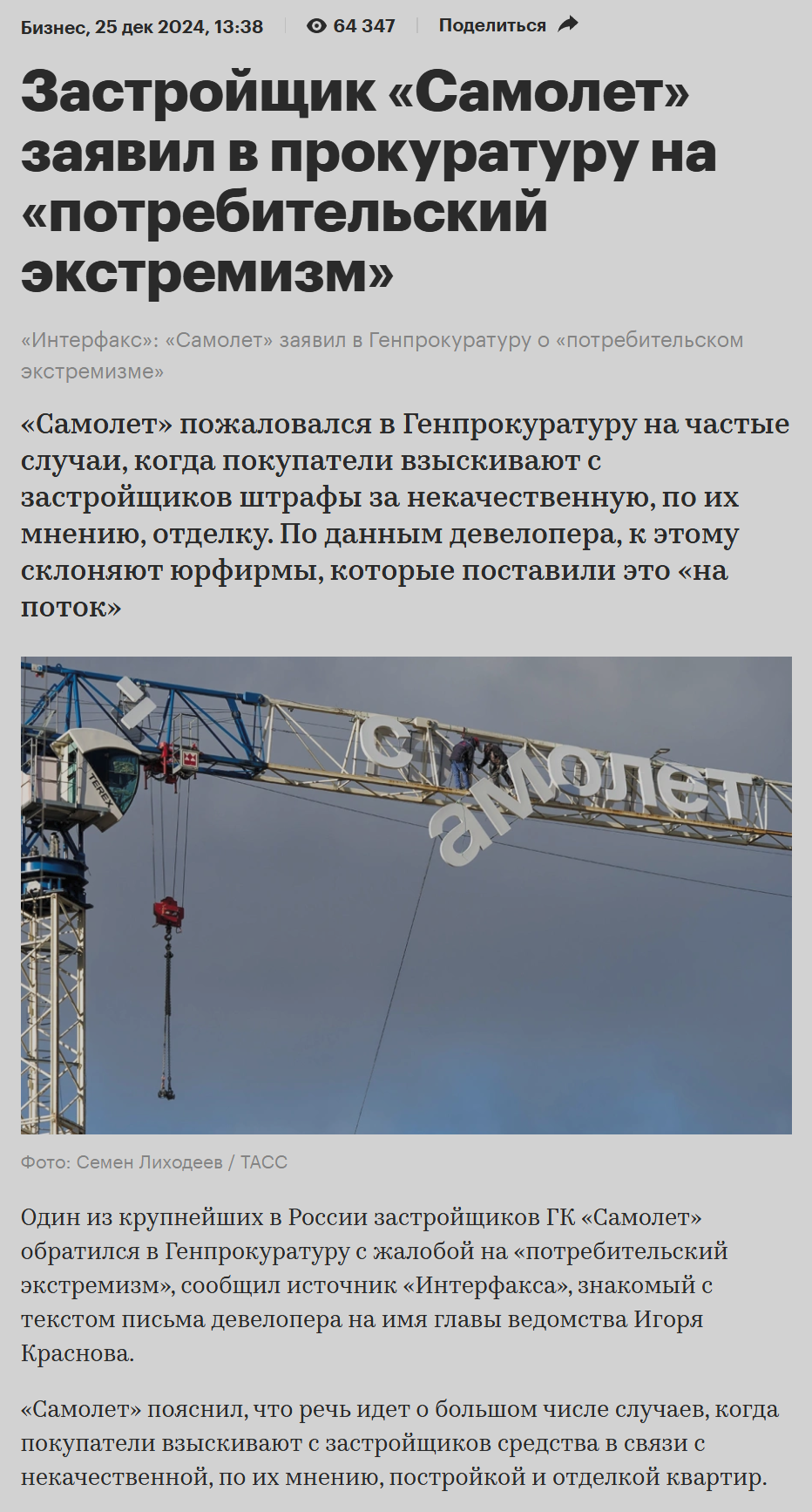 "самолет" реально в жопе из-за 20% ставок по ипотеке, продажи упали вдвое, но государство не высасывает кровь, а стабилизирует: уже льготные ипотеки продлили, субсидии качают. акции с выкупом - это не раздача, а партнерство, чтоб не обанкротились и стройки не встали. без этого кризисом пахнет, а с ним - ростом безработицы и брошенными домами.