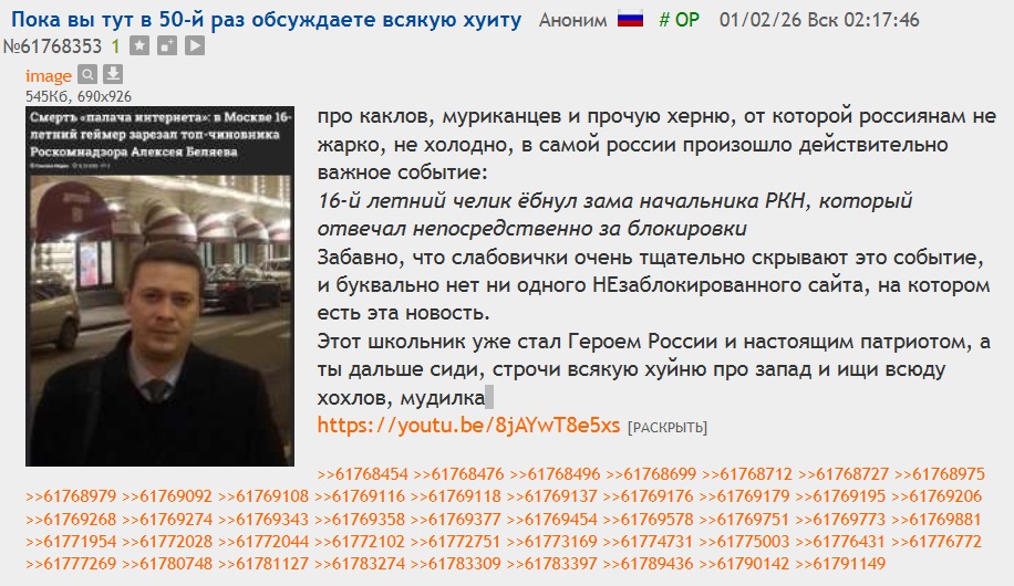 до кого дошло что она сработала? вопрос почему так, в том треде же атаковали самого ДУШИТЕЛЯ а не его зама? ну так я лично надрывался полтреда объясняя почему убивать людей проклятиями это плохо для кармы + провел ритуал защиты, ну а тк любой ритуал это энергия в первую очередь и ей нужно где-то было выплеснутся, прям как сопромат - рвется там где тонко, матрица пошла на компромисс. ага, у нас есть проклятье на смерть ДУШИТЕЛЯ, но у нас есть и защита от смерти для ДУШИТЕЛЯ, также у нас претензия чтобы убийство в карму не засчиталось. решение: покапать на мозги левому школьнику чтоб он насадил на нож первого попавшегося ДУШИТЕЛЯ. как система это сделала? очень просто: ваши тела не ваши тела, а социалистическая собственность, соответственно и подкрутить биохимический баланс гормонов в нужный момент, например в момент мысли об убийстве ДУШИТЕЛЯ, не составляет проблем. успешность атаки кстати ещё объясняет перебои с сервером 2ча - маги фсб охуели от такого пробития и сейчас собираются устроить что-нибудь эдакое всем участникам, для этого и арестовали сервера - чтоб айпишники найти. так что совет всем участвовавшим: ходите осторожно. легально они вам предъявить ничего не могут, а вот провернуть с вами тоже самое чтобы вас самих какой-нибудь кавказец на нож посадил вполне. в случае чего просто вспоминайте сцену с нигамоментом из The Boondocks. совет (((бдительным гражданам))): прекращайте блокировки, второй раз я никого ни от чего отговаривать не буду, и вы вполне можете узнать все непредвиденные последствия своих действий.