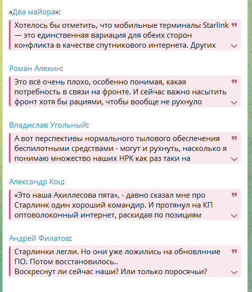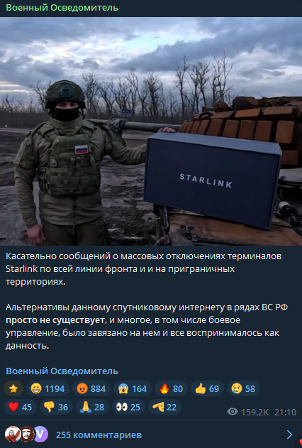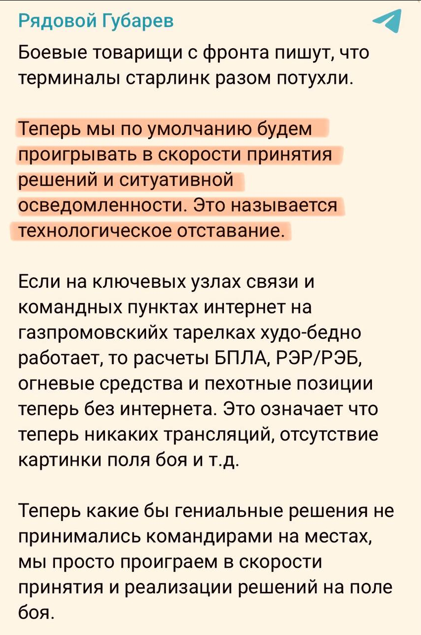 Старлинк нужно было отключать, это в интересах ВС РФ, очевидно что он не мог работать бесконечно, очевидно что задачи стояли по организации спутниковой связи, самое время поднимать эти вопросы на первое место и разбираться кто там что воровал и саботировал и решать этот вопрос.