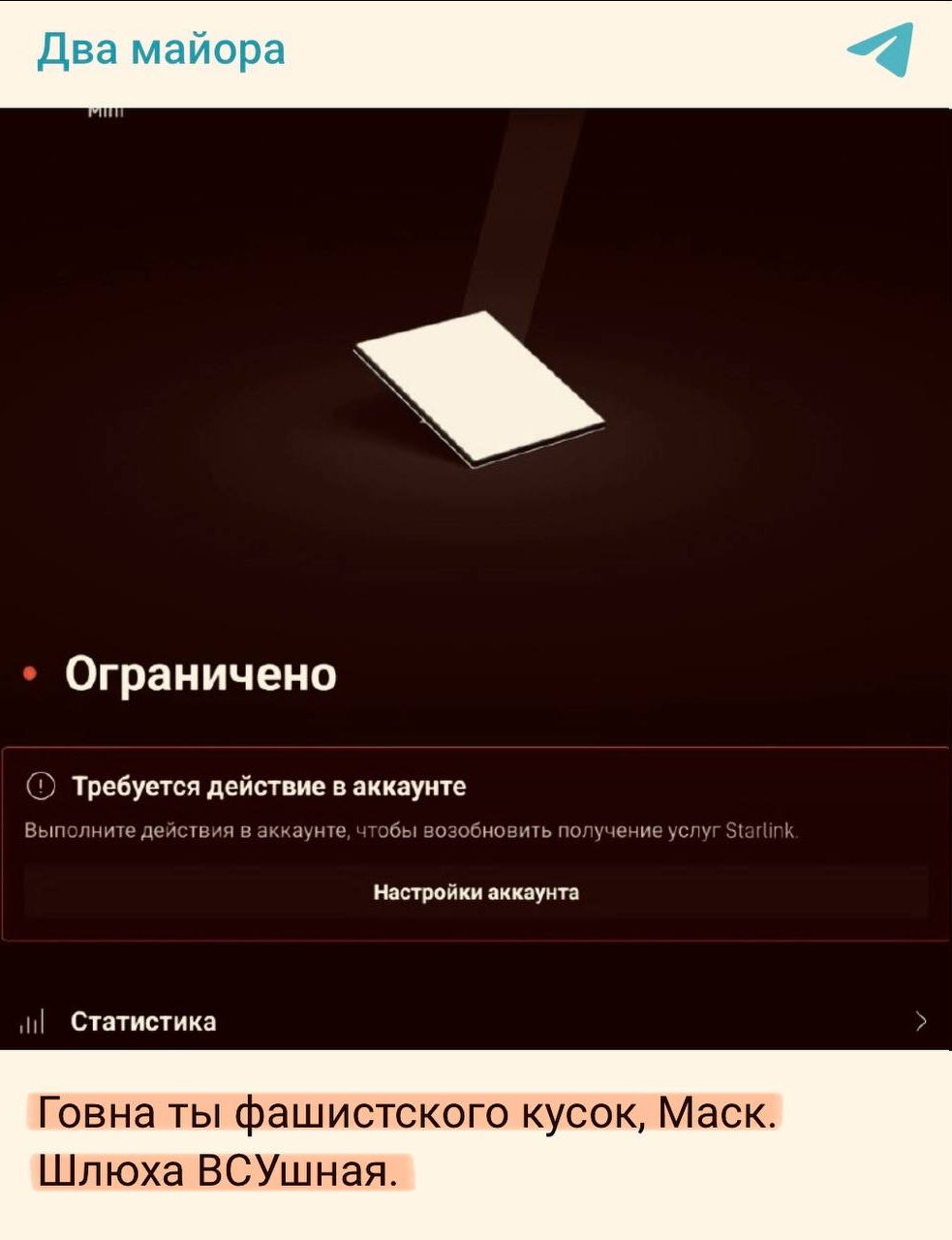 спс анон, стараюсь не срать пастой а по делу бить. маска с его спутниками давно на поводке у пиндоса, старлинк им там нужен чтоб дроны гонять, а не для мирных тянок в тиктоке