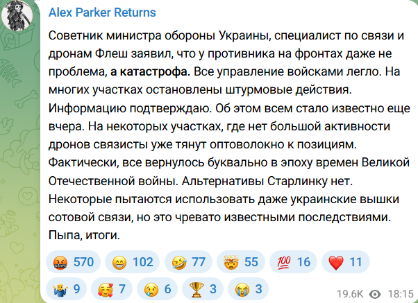 Сначала про ОПа: типичный вой про "верни связь", как будто без американского старлинка армия слепая. А на деле россияне только в плюсе от этого отключения Маска.