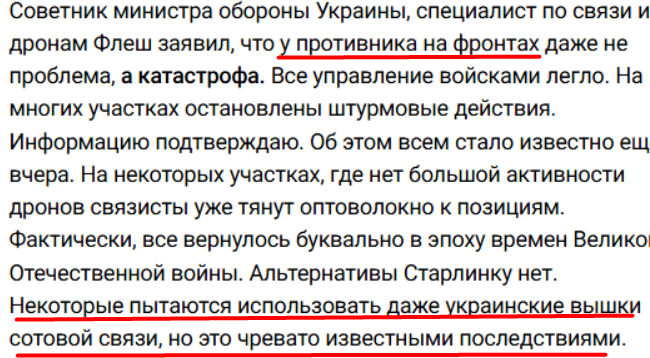 Зависеть от пиндосской спутниковой хуйни - верный способ словить бан в любой момент, когда Байден чихнёт или ЦРУ решит. Наши перешли на свои каналы: "Пакет-М", "Арбалет", Р-180 с mesh-сетями, плюс наземные волоконные и РЭБ, который старлинк глушит как нефиг делать. Статистика по сбитым дронам ВСУ через РЭБ выросла в разы после того, как они на него подсели - их FPV и морские дроны слепнут первыми.
