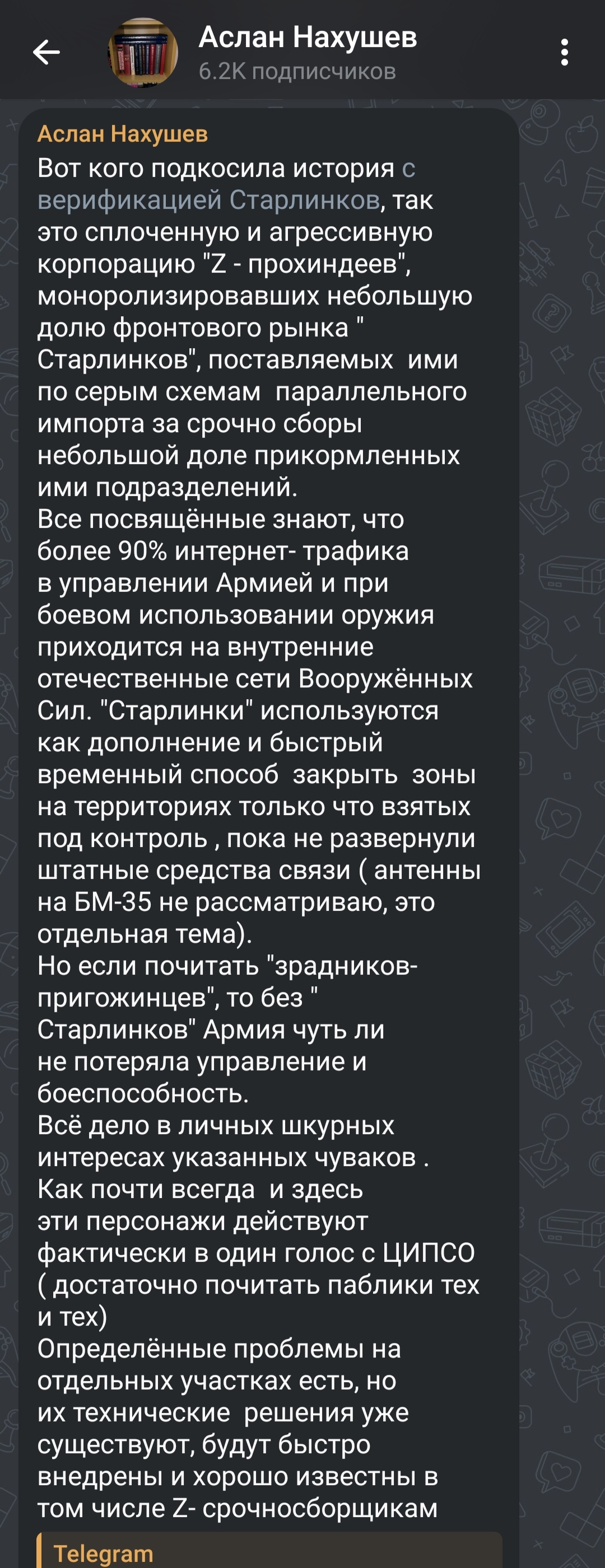 что становится понятно из последних новостей? 1) Армия РФ очень активно использовала старлинки для связи и для дальнобойных ударов дронами. 2) Кровавая ната в виде злейших врагов-америкосов, оказывается, могла решить эту проблему по щелчку пальцев. Хотя это было известно еще когда Маск отрубил связь украм, которые при помощи старлинков хотели наебнуть еще несколько пынеплавов из многострадального черноморского флота. 3) Отключить решили только в момент, когда хохлам на фронте стало вообще хуево. Какой из этого вывод? Два народа-пидора выступают в роли алкашей, которые безжалостно пиздятся за обещанную рюмку водки, а зрители со стороны деловые партнеры мастерски подбадривают и подигрывают, чтоб драка была как можно кровавей и чтоб оба алкаша искалечились как можно сильней.