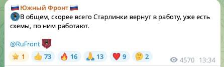 «Из 15 Starlink - 11 уже в работе, ещё 4 ожидаем, держим на контроле. Дополнительно можем подтвердить: Starlink работают в Курской области!!! Задача на сегодня - систематизировать и структурировать весь процесс по активации», — написал Z-канал «Техник БПЛА».