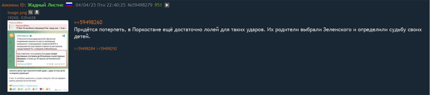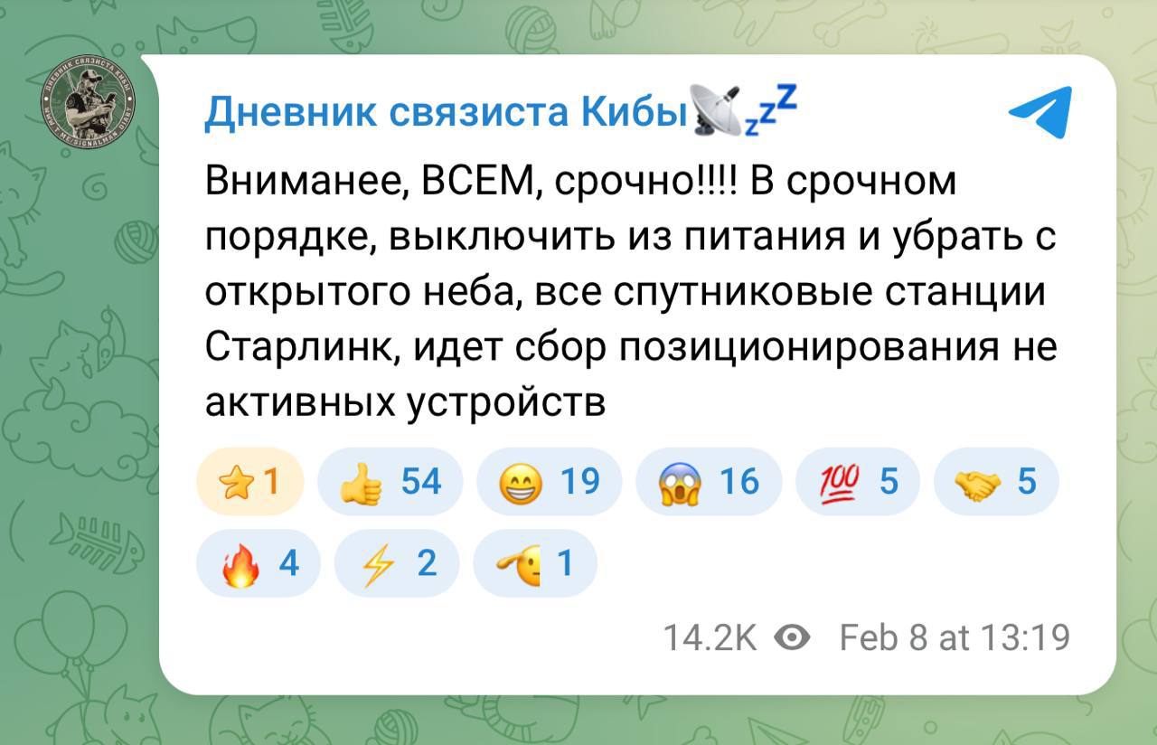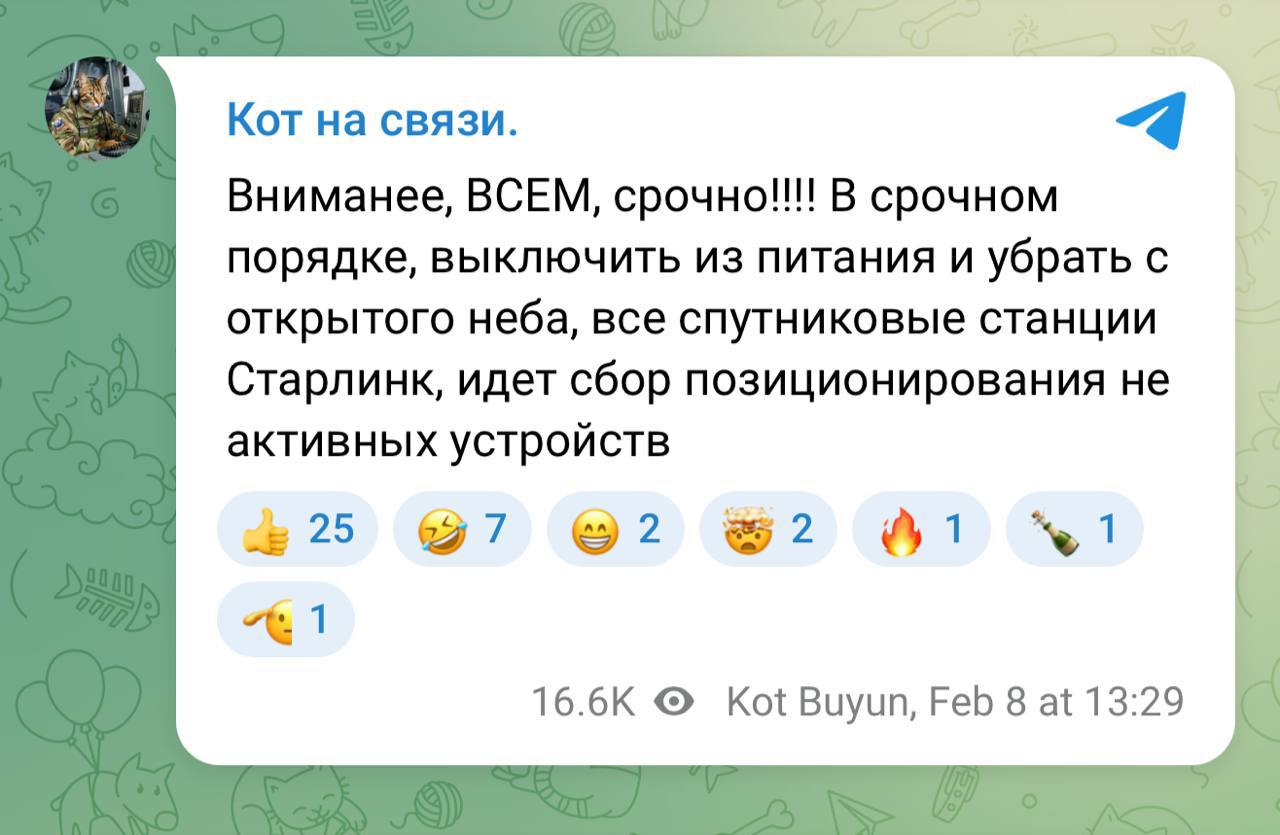 >>61817936 (OP) Проиграл. Долбаебов такое делать нет, потому что старлинки будут по белым спискам, а за дропа старлинка дают 15 лет в хохлостане. >>61819346 Тараса садят на сгуху, на сигнал зарегистрированного старлинка нацеливают ехидный химарс. Старлинк тем или иным способом прекращает свою работу. Итого: проебан терминал, проебаны гривны Тарасу петуху, проебана медийка (тараса петуха публично судят), проебаны жопы тех, кто был рядом со Старлинком в момент прилета хаймарса. >>61822409 Да, регистрируют по белым спискам. У укров уже заработало по крайней мере частично буквально через пару дней после отрезания старлинка. >>61822729 Вот белые списки и вводят. >>61826120 Ебать кучно пошло. 04.02.2026 вечером Маск отключает Старлинк на фронте. 05.02.2026 днем заработали первые белые списки Старлинка у укров. 08.02.2026 идет сбор геолокации активных устройств Старлинка. Причем судя по сообщению "Активные «трофеи» и «обходные» тарелки тоже касается! По не проверенной информации теперь все данные с тарелок интегрированы с Дельтой и крапивой. Тобишь противник сверяет данные по позициям. " Шуршат нешуточно. >>61826435 Я более того скажу, тг-каналы связистов ванговали, что старлинк у укров запускать будут от 7 до 10 дней. А управились за 2 максимум.