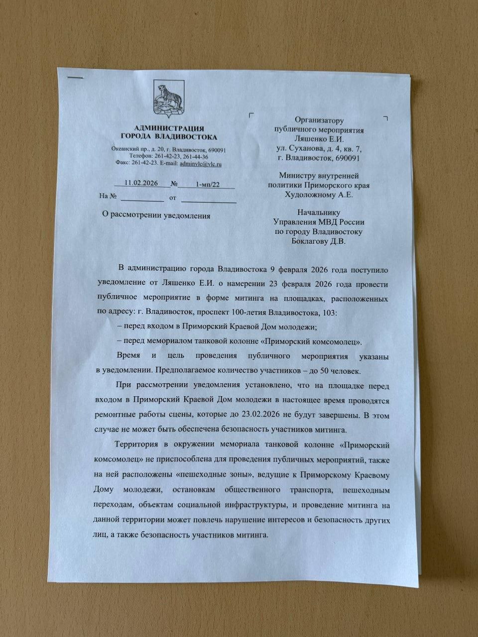 Приморская ячейка КПРФ возмутилась действиями региональных властей — те отказались согласовывать митинг в поддержку СВО на 50 человек 23 февраля по двум предполагаемым локациям.