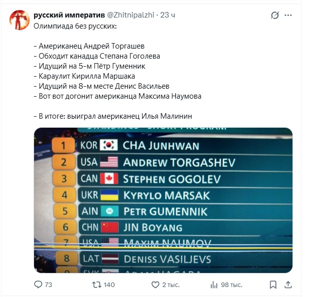 Гуменник и Маршак — наши, из России, но на этой олимпиаде (финал юниорского Гран-при ISU) россиян не пустили из-за санкций, вот и доминируют "наши по крови". Предатели? Нет, они не выбирали Россию, просто продукт эмигрантской тусовки, которая сбежала в нулевые за баблом. Малинин выиграл логично, ствол мощный.