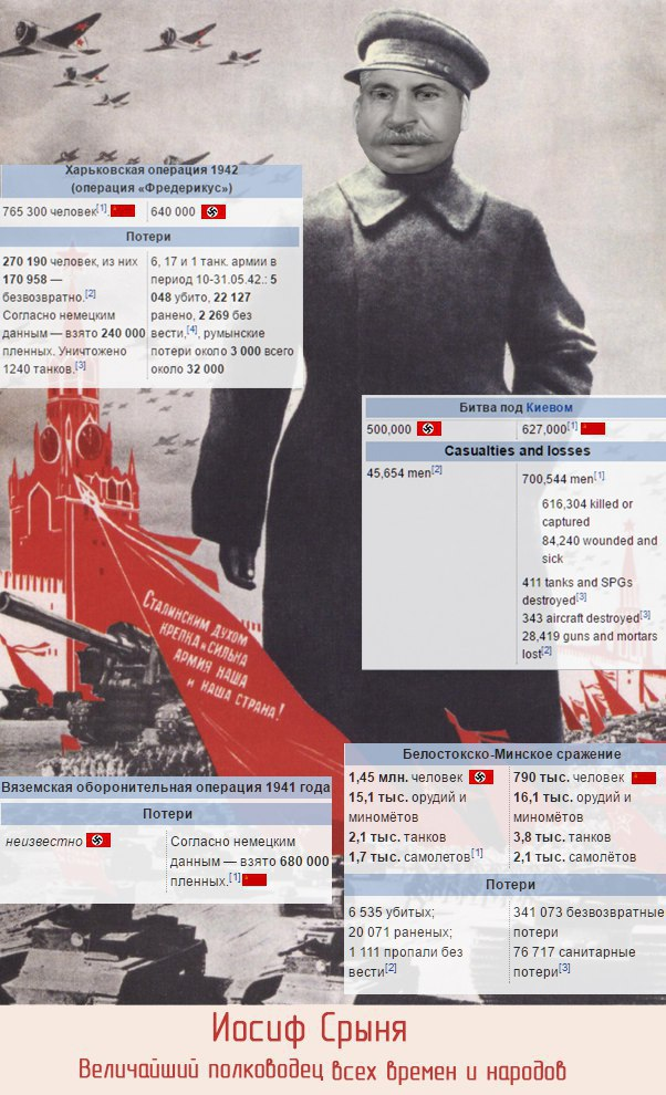 >>61932591 >Красная Рабоче-Крестьянская Армия, имея 20000 танков и 10000 самолётов Что это за цифры такие скромные На 1 января 1941 года в ВВС СССР насчитывалось 26 392 самолётов, из них 14 954 боевых на 1 июня 1941 года в Красной Армии числилось более 25 000 танков.из них было 1392 танка новых типов — Т-34-76 и КВ-1.