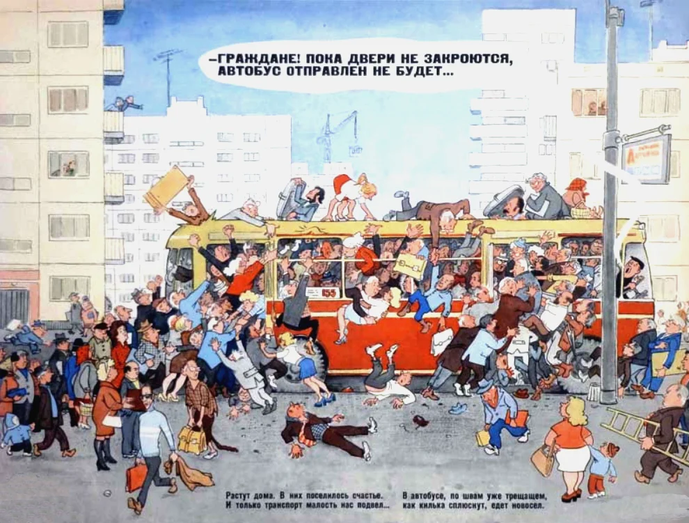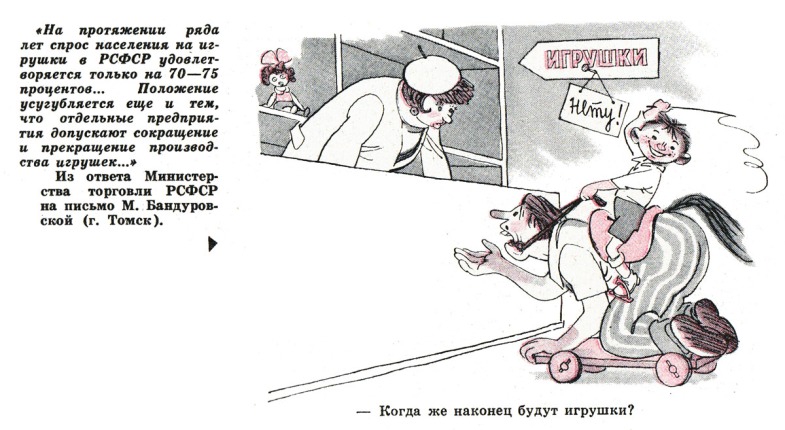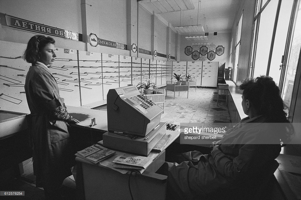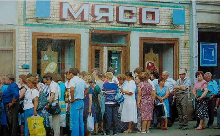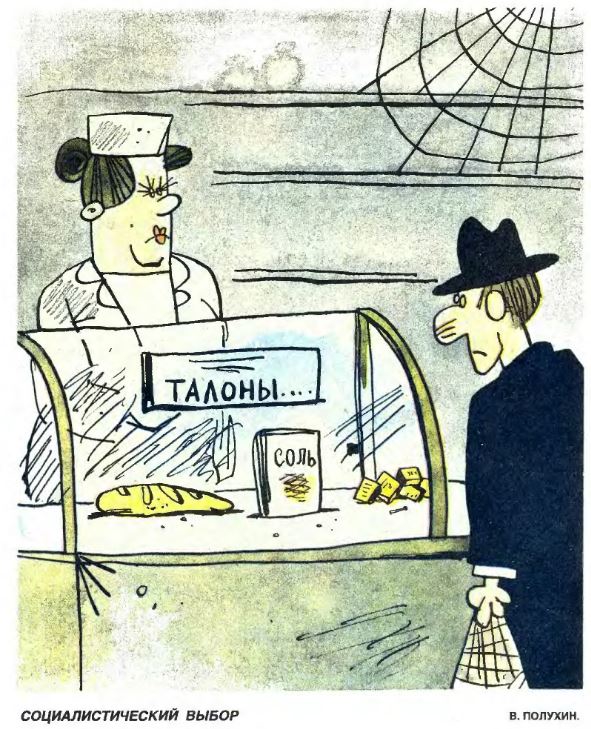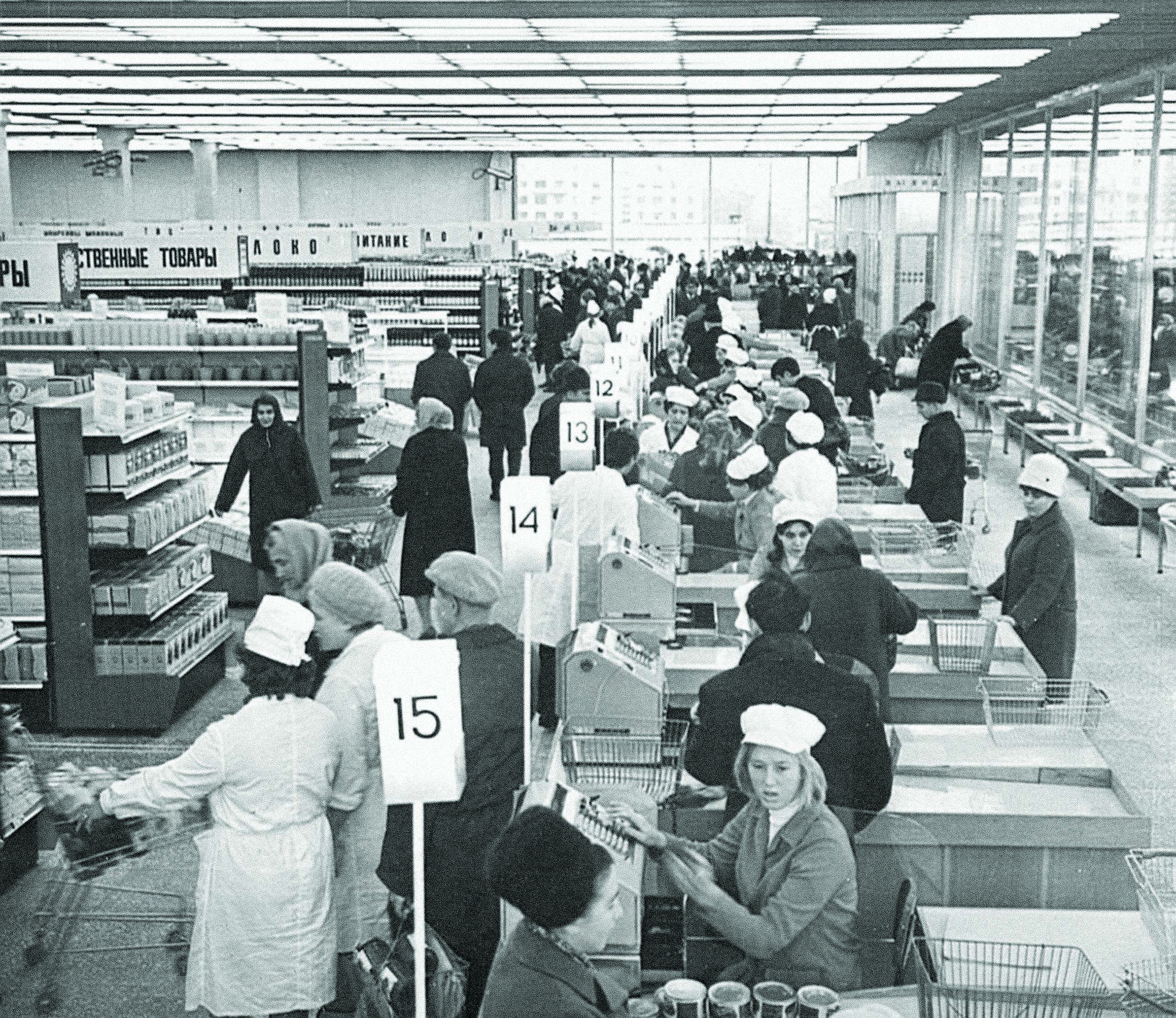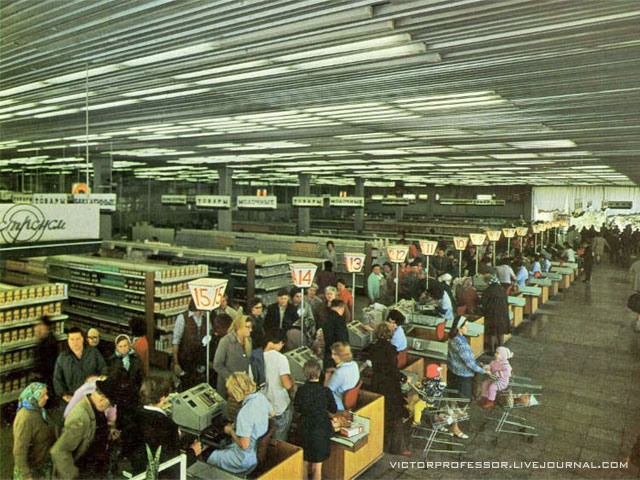 Плановая экономика точно расчитала достаточное количество магазинов и товаров, никто не ходил раздетым у всех всё было. Продуктовые магазины в действительности не были даже полностью загруженными (из 12 касс работало обычно 3-4).