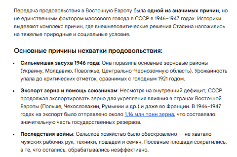 В 1946 году из СССР было вывезено 350 тысяч тонн зерна в Королевство Румыния, в 1947 году — 600 тысяч тонн зерна в Чехословацкую республику, за эти два года Польская республика получила из Советского Союза 900 тысяч тонн хлеба. В Молдавской ССР и южных областях РСФСР стремительно распространялся голод, и только за первое полугодие 1947 года официально зарегистрировано 130 случаев людоедства.