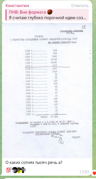>>61912704 >если тебя посадили не за что Спасибо, я уже почитал уголовные дела людей, которые утверждали, что их посадили «ни за что». Я ещё потом долго поражался насколько советская власть травоядная в этом плане была, потому что этих низашо посадили расстреливать надо было.