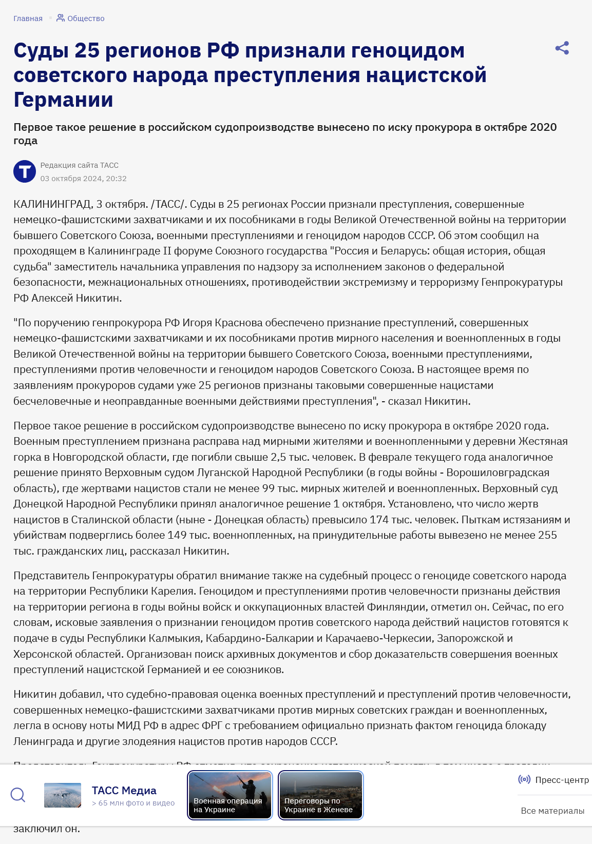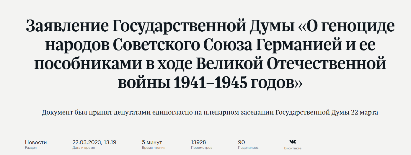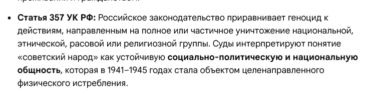 >>61917013 >"Геноцид против советских граждан" появился как законодательно закрепленный термин Кто на ком стоял ? Нет, правовым основанием для утверждения о имевшем месте геноциде являются соответствующие решения судов, а не заявление Госдумы: >>61912999