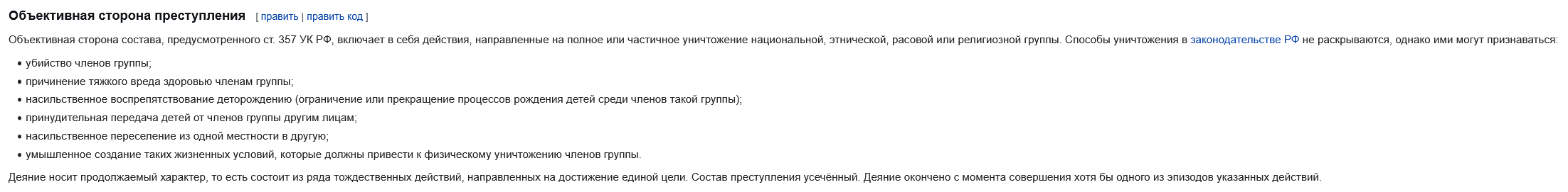 >>61911385 >Геноцид это когда по этническому признаку выпиливают >мер, рассчитанных на предотвращение деторождения в такой группе; >насильственной передачи детей из одной человеческой группы в другую; >предумышленного создания жизненных условий, рассчитанных на полное или частичное физическое уничтожение этой группы. Буквально из определения геноцида которое сам совок же признавал