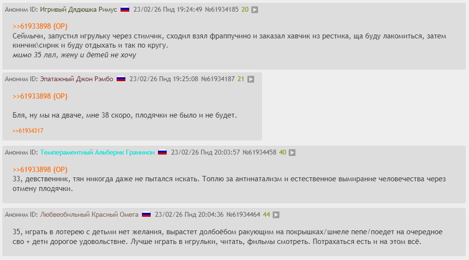 >>61940746 >Считаю, что каждый русский, у кого нет без уважительных причин минимум трёх детей - мразь и мудак