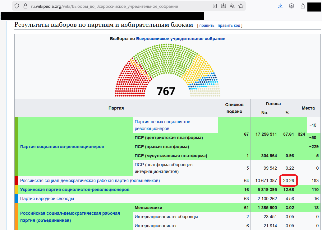 >>61955845 > Нет, за большевиков проголосовало менее четверти пришедших на выборы в 1917. Это причём на организованных ими самими выборах, на незамедлительности которых они сами громче всех и настаивали, за откладывание которых активнее всех критиковали Временное правительство, а после неудобных результатов сами же его и разогнали, чем ещё и бравировали потом в своих баснях ("караул устал" и вот это всё).