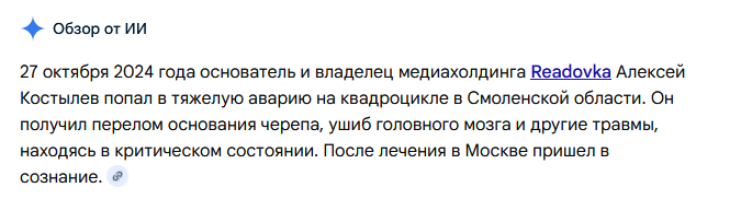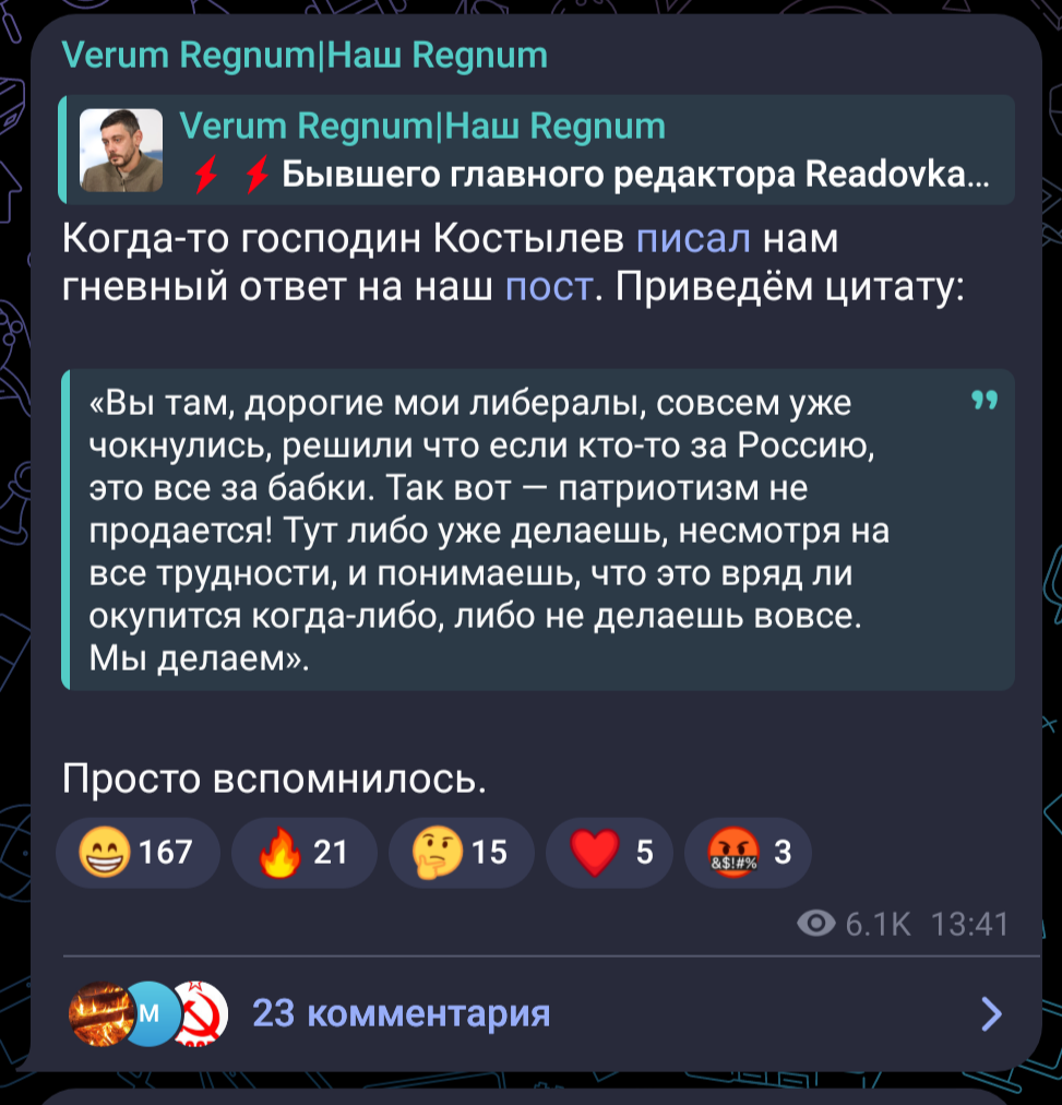 У Костылева изначально были плохие отношения с силовиками. Человек всегда занимался сливами и их торговлей. Сначала был такой либерал-националист. Крутил активно тему мигрантов. Чуть не получил уголовное дело по статье экстремизм. На этом фоне стал правильным патриотом. На удивление силовиков вошел в информационный штаб СВО по инициативе Кремля. Но торгаш- остается торгашом. Readovka набирала объемы, гранты. Финансирование текло рекой на фоне ступора традиционных медийных персон. За месяцы Readovka превратилась в пропагандистскую корпорацию. Денег было очень много. Учета и отчетности было очень мало. Все закончилось осенью 2024- когда Костылев попал в ДТП и превратился в инвалида. Первые проверки показали невероятный уровень левой отчетности и вывода средств под странные проекты. Позднее издание Readovka у Костылева отобрали и отдали в руки АНО «Диалог».