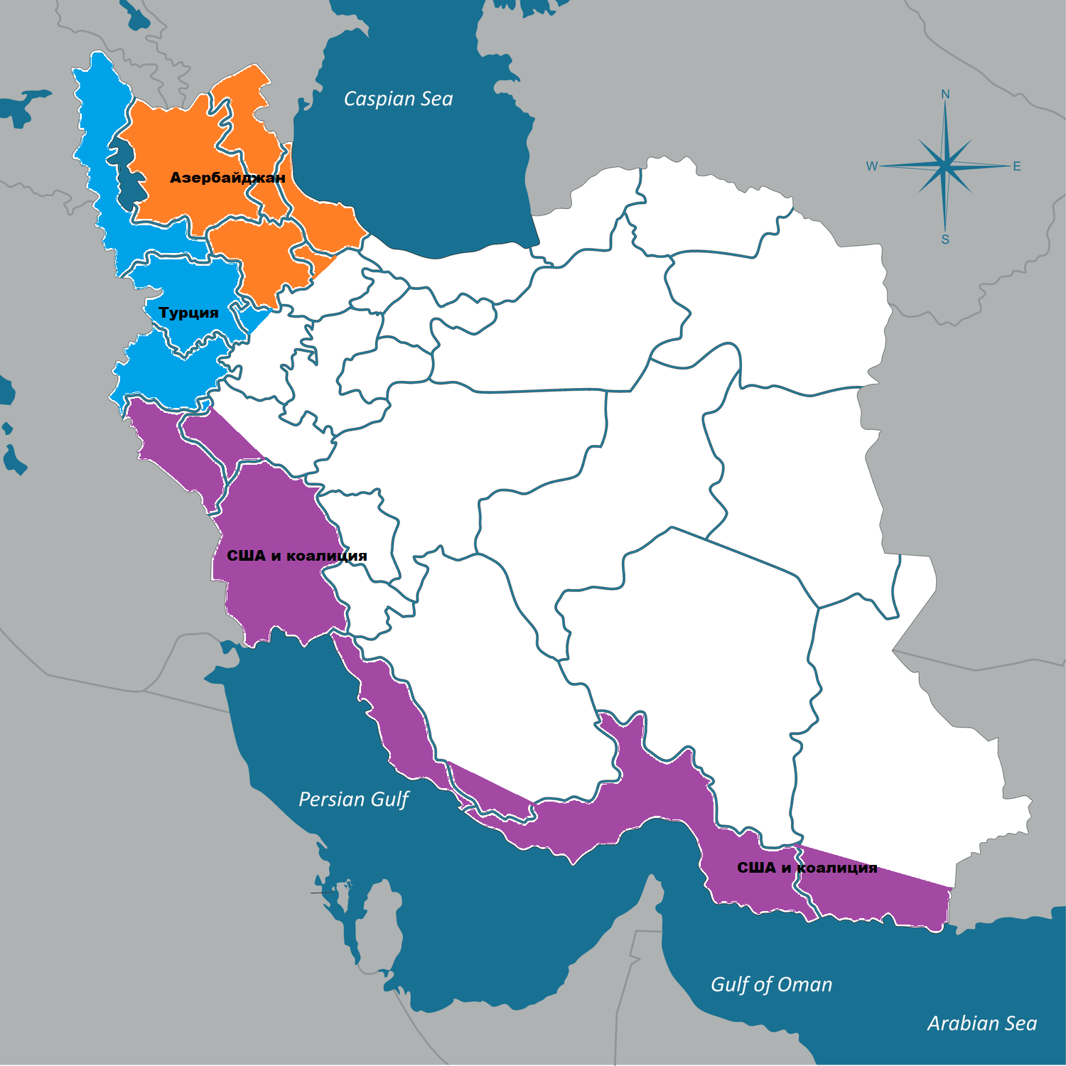 Короч, турки и азера забирают западный азербайджан тебриз, мехабад, курды забирают территории напротив сулеймании - сенендедж, керманшах. Сша заходят из эрбиля и басры, двигаются в исфахан-тегеран, а также на побережье - бушер и далее к ормузскому проливу. Марины высаживаются из омана, оаэ и катара. по логике, уже сейчас нужно брать аэропорт и аэс в бушере и вышки в море, порт в бендер-аббасе