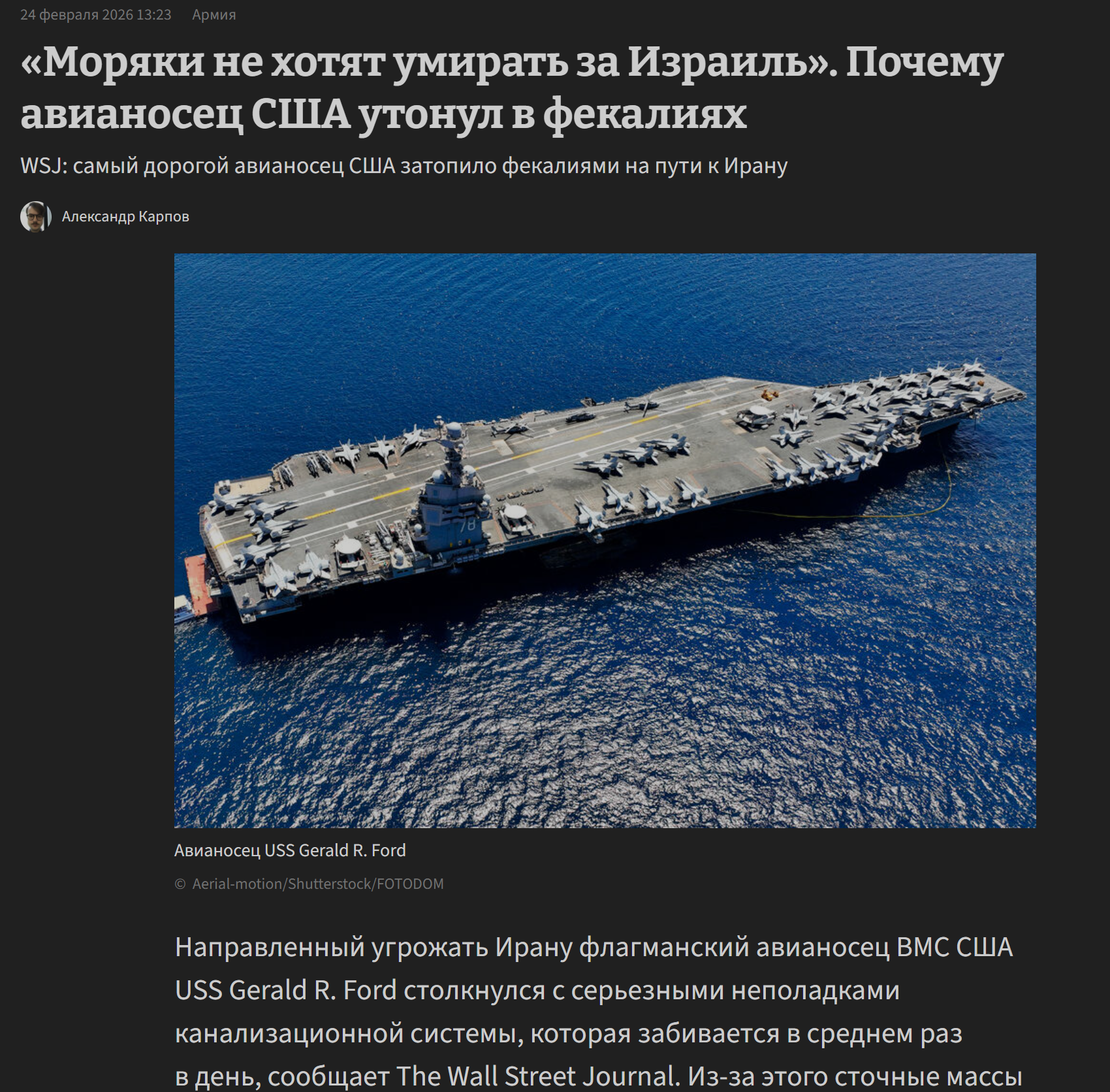 Иран вообще слабаки. Я не верю в невероятную ахуенность авианосцев. Представим что авианосцы вошли в Черное море и атакуют Россию. Ну их же 100% всех бы разъебали