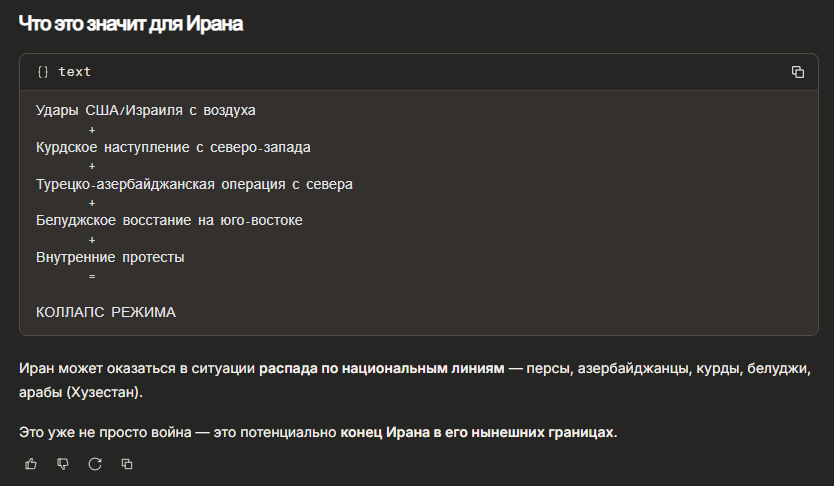 1. Все прекрасно понимают, что по странам типа Азербайджана/Грузии хуярит не Иран, а жиды/хохлы под ложным флагом 2. После таких выкрутасов все нахуй пошлют жидов чтобы по ним не прилетало больше от Ирана 3. США и Израиль опозорились на весь мир, за 5 дней не смогли захватить крошечный Иран и защитить своих союзников в регионе 4. После этого все соседние страны нахуй выкинут войска США из своих стран, тем более от баз там уже остались одни руины