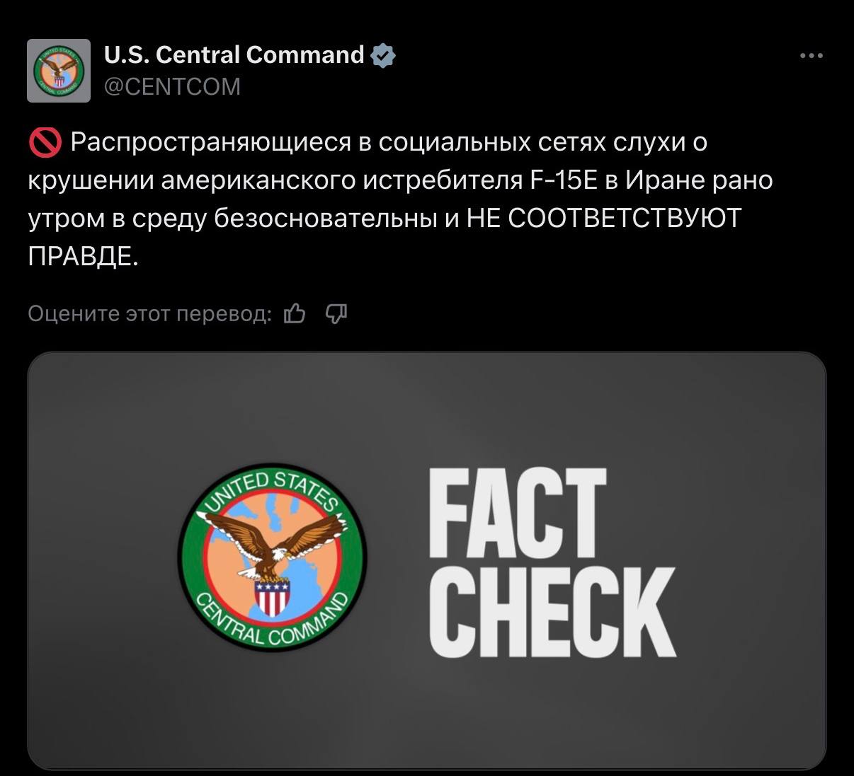 ⚡️Распространяющиеся в социальных сетях слухи о крушении американского истребителя F-15E в Иране рано утром в среду безосновательны и не соответствуют правде, — Центральное командование США.