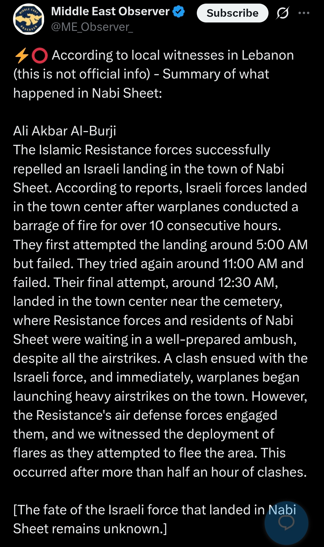 Согласно их заявлению, были обнаружены 4 израильских вертолета, входящих в ливанское воздушное пространство со стороны Сирии, которые затем высадили пехотный отряд в районе Храйбе, после чего тот продвинулся к городу Наби-Чит.