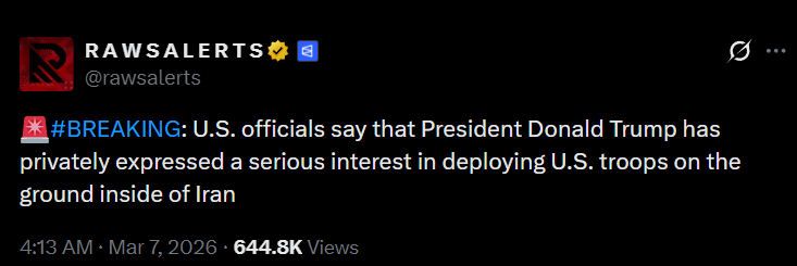 По словам источников, Трамп обсуждал идею размещения сухопутных войск с помощниками и представителями Республиканской партии у Белого дома, излагая свое видение послевоенного Ирана, в котором иранские запасы урана будут в безопасности, а США и новый иранский режим будут сотрудничать в добыче нефти аналогично тому, как это происходит между США и Венесуэлой.