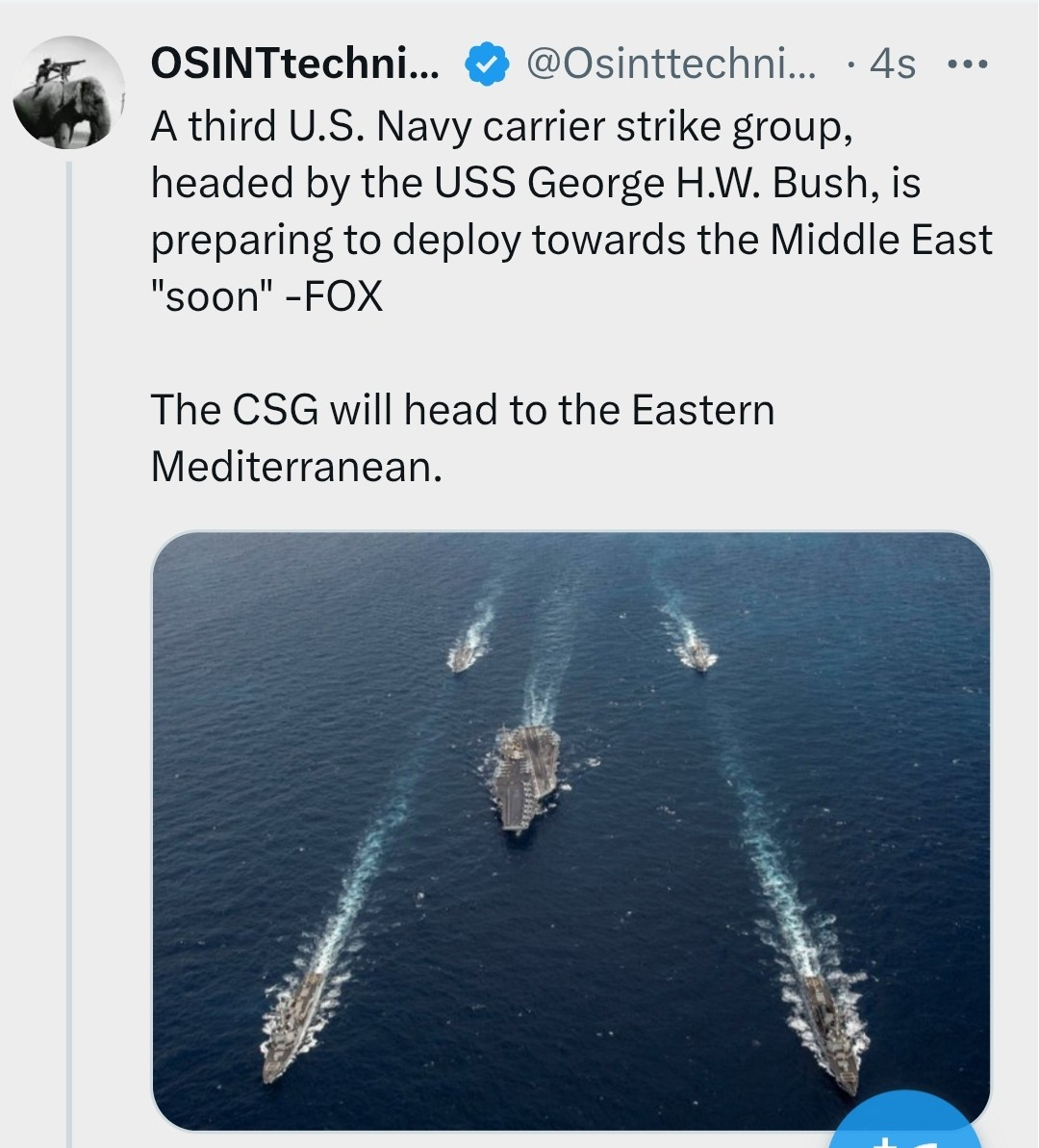 СМИ пишут со ссылкой на источник в Белом доме, что в самое ближайшее время в Восточное Средиземноморье выйдет третья американская авианосная группа, чтобы усилить союзные силы в регионе. На этот раз речь об авианосце «Джордж Буш». Он несет на борту до 90 самолетов и вертолетов.