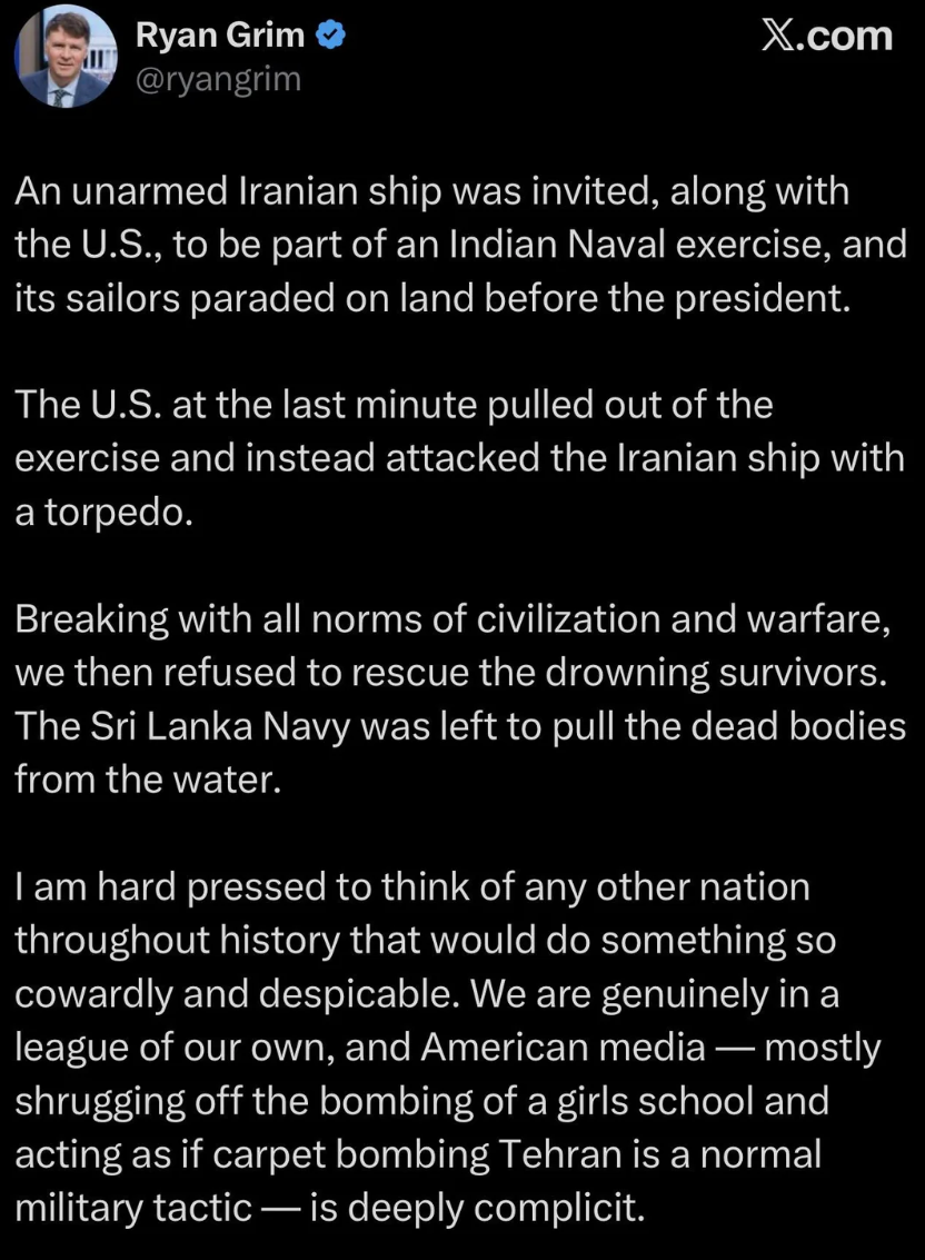 Бывший чиновник Министерства обороны США Дэвид Т. Пайн: • Администрация Трампа лжёт по поводу количества американских жертв в войне с Ираном • Оценки США по общему количеству иранских баллистических ракет намного ниже реальности, так как я считаю, что у Ирана может быть десятки тысяч ракет в своём арсенале • США и "Израиль" сталкиваются с серьёзной нехваткой наступательных ракет и систем противоракетной обороны, причём последние, вероятно, будут исчерпаны к следующей неделе.