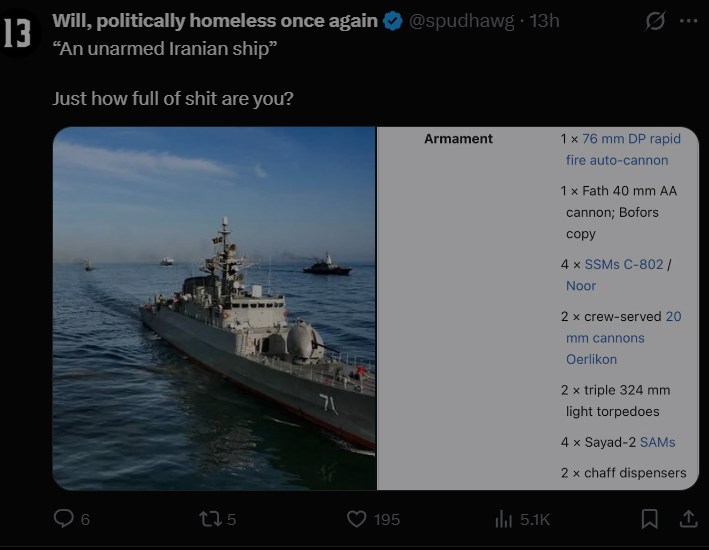 А РОССИЯ ОКАЗЫВАЕТСЯ СЛИВАЕТ ИРАНУ КООРДИНАТЫ АМЕРИКАНСКИХ КОРАБЛЕЙ И САМОЛЁТОВ WASHINGTON POST ПИШЕТ СО ССЫЛКОЙ НА ТРЁХ ЧИНОВНИКОВ У ИРАНА СВОИХ СПУТНИКОВ НЕТ А РОССИЯ ТАКАЯ НУ МЫ ЖЕ НЕЙТРАЛЬНЫЕ МЫ ПРОСТО ПОДСКАЗЫВАЕМ КУДА СТРЕЛЯТЬ ЭТО КАК В МОРСКОМ БОЕ СИДЕТЬ РЯДОМ И ШЕПТАТЬ БЭ ДВА БЭ ТРИ