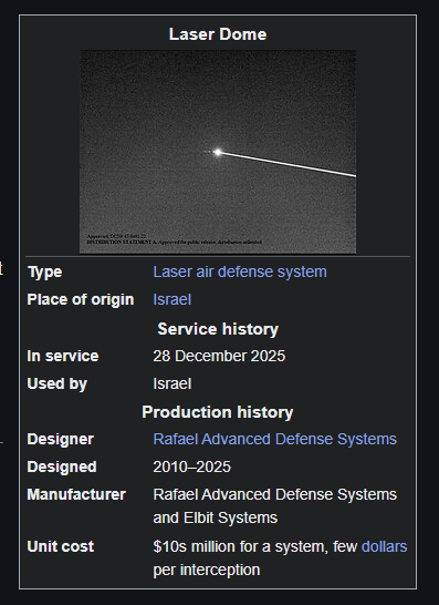>>62062822 Ну лазерный-то вполне норм, суды по шебму, который был. хезболлинские ракеты сдыхают ещё на взлёте, да и против говноперделок был бы отлично. Мало их, да и Израиль не отдаст заливным арабам - это да.
